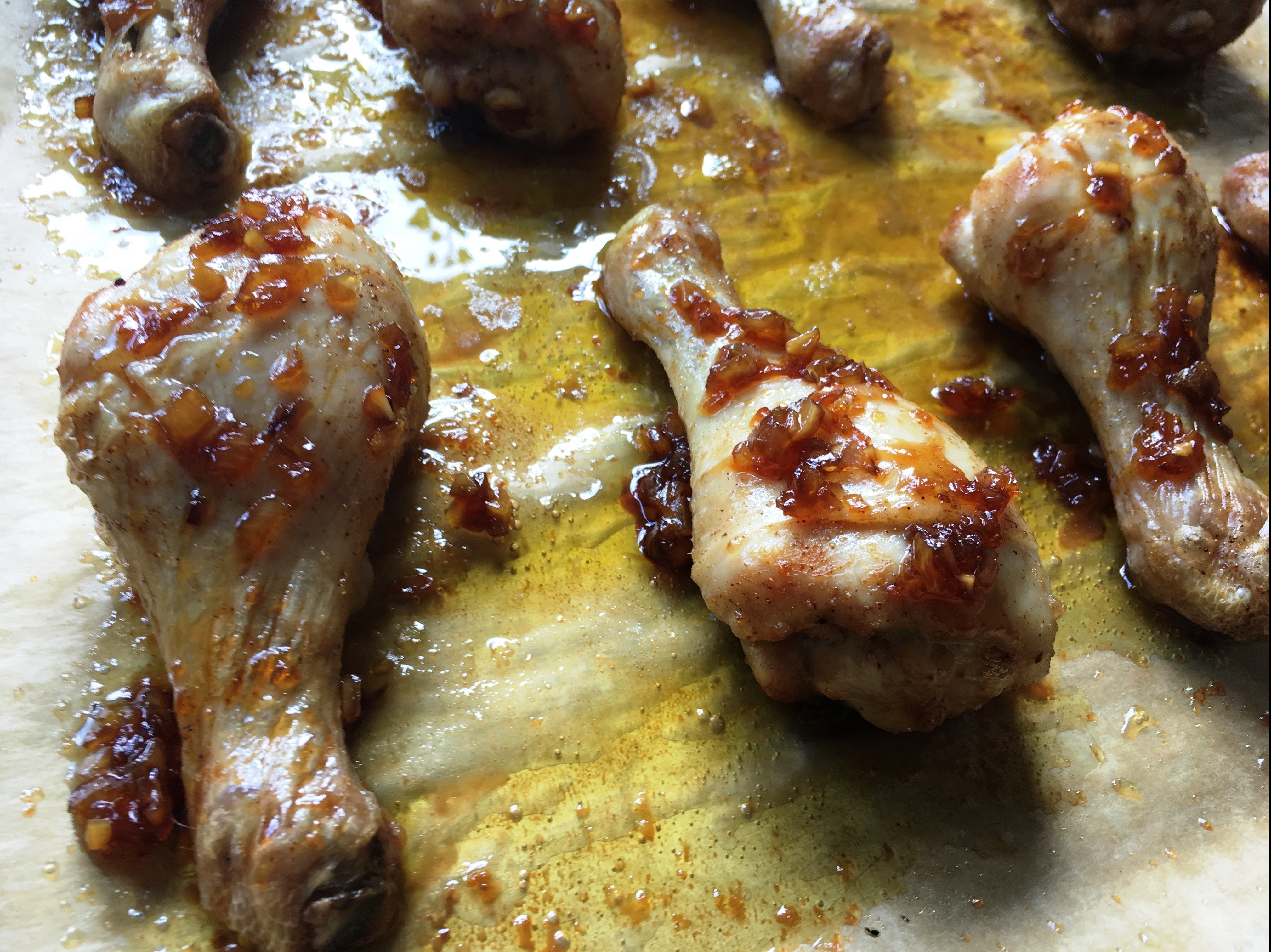Zwiebeln und Knoblauch andünsten mit Zitronensaft, Honig, Sojasoße und Wasser eingeköchelt - Wenn die 30 Minuten um sind, die Hähnchenflügel mit der Honig-Zitronen-Mischung bestreichen.