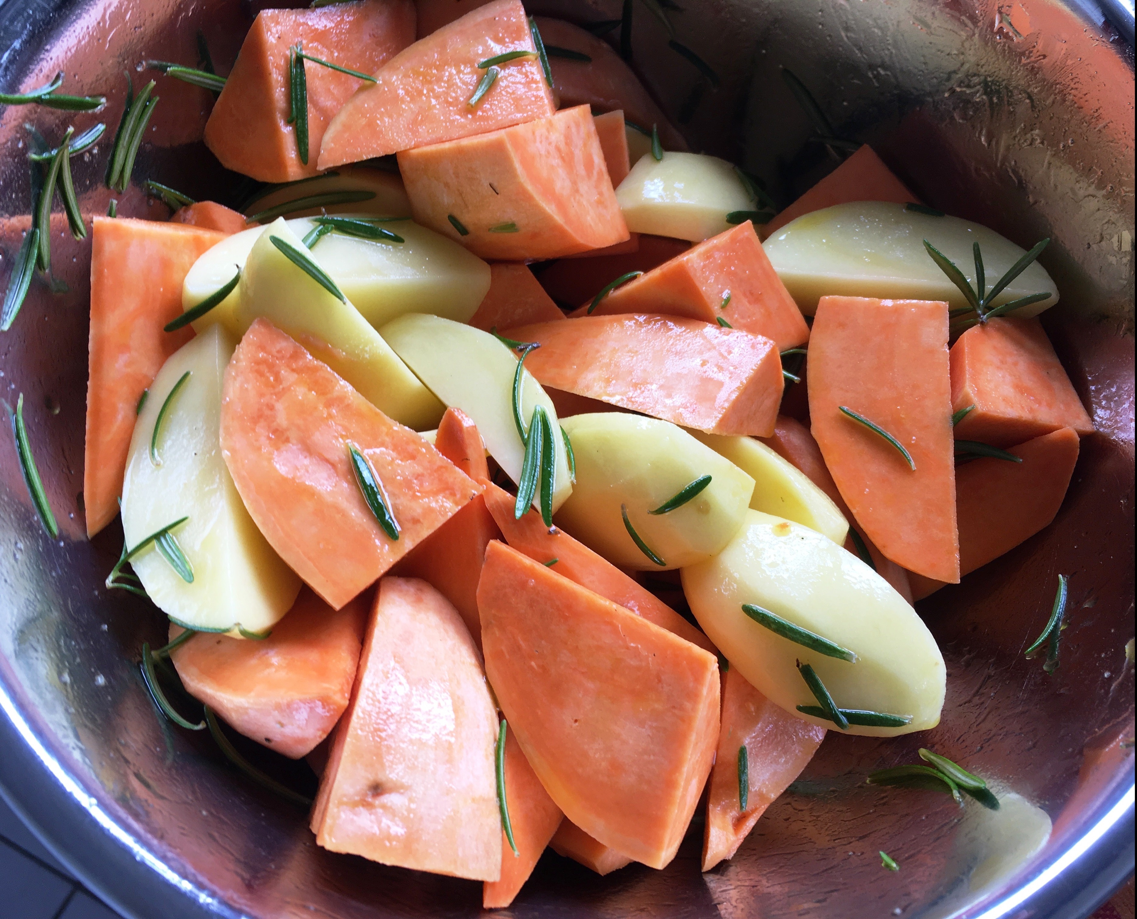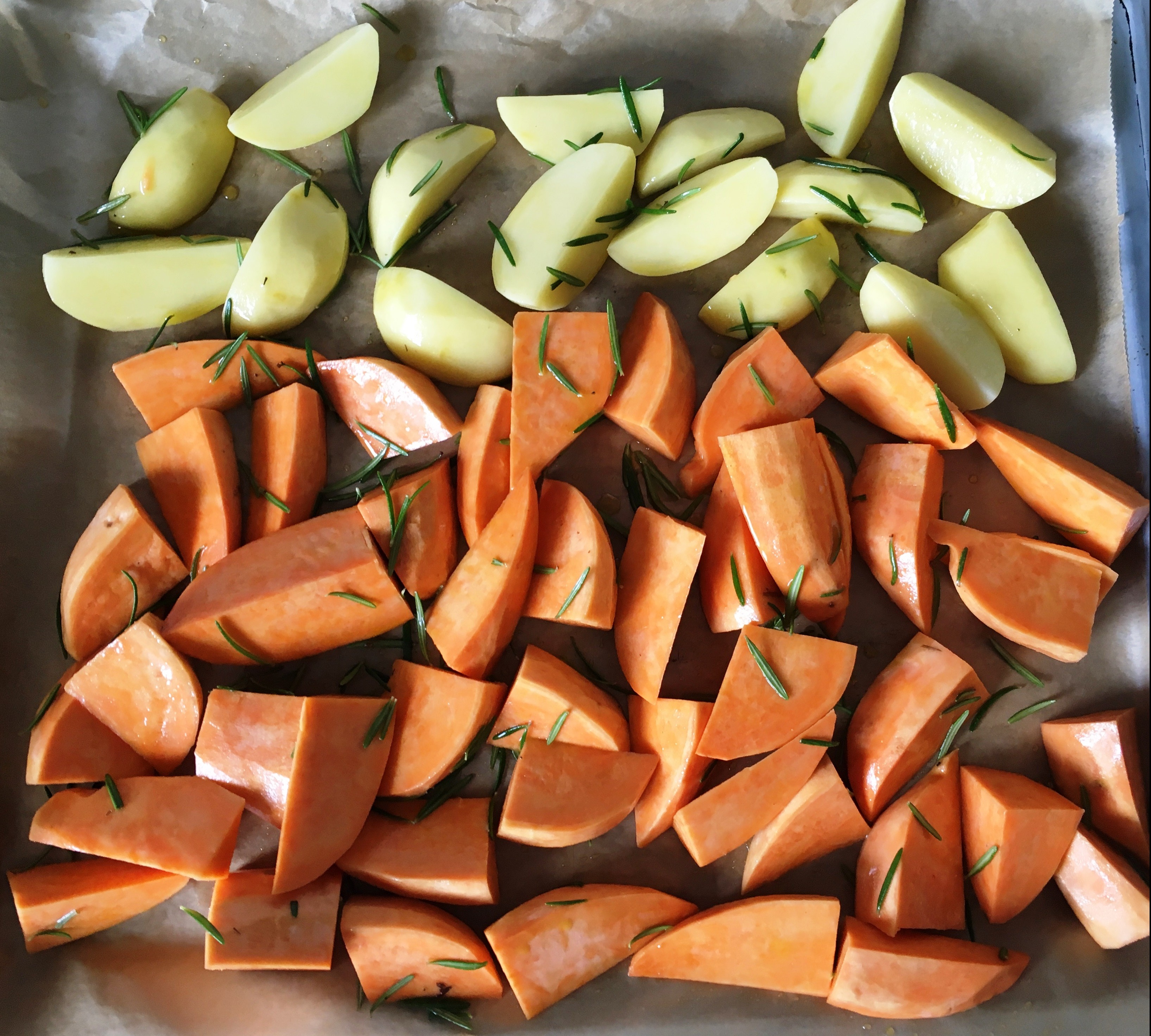 Egal ob ihr lieber Kartoffeln oder Süßkartoffeln mögt, das Rezept ist für beides super anwendbar. Lediglich die Backzeit im Ofen ist entsprechend anzupassen. Für die Kräuter und Gewürze könnt ihr eurer Fantasie komplett freien Lauf lassen. Ich mag ja die klassische Rosmarin-Variante 🙂