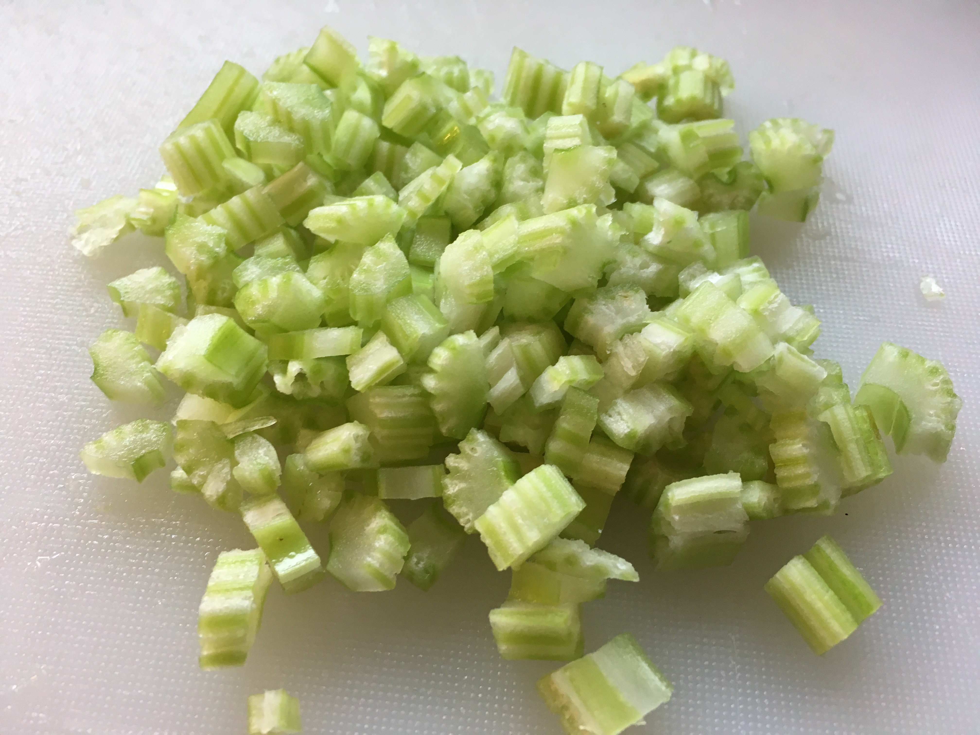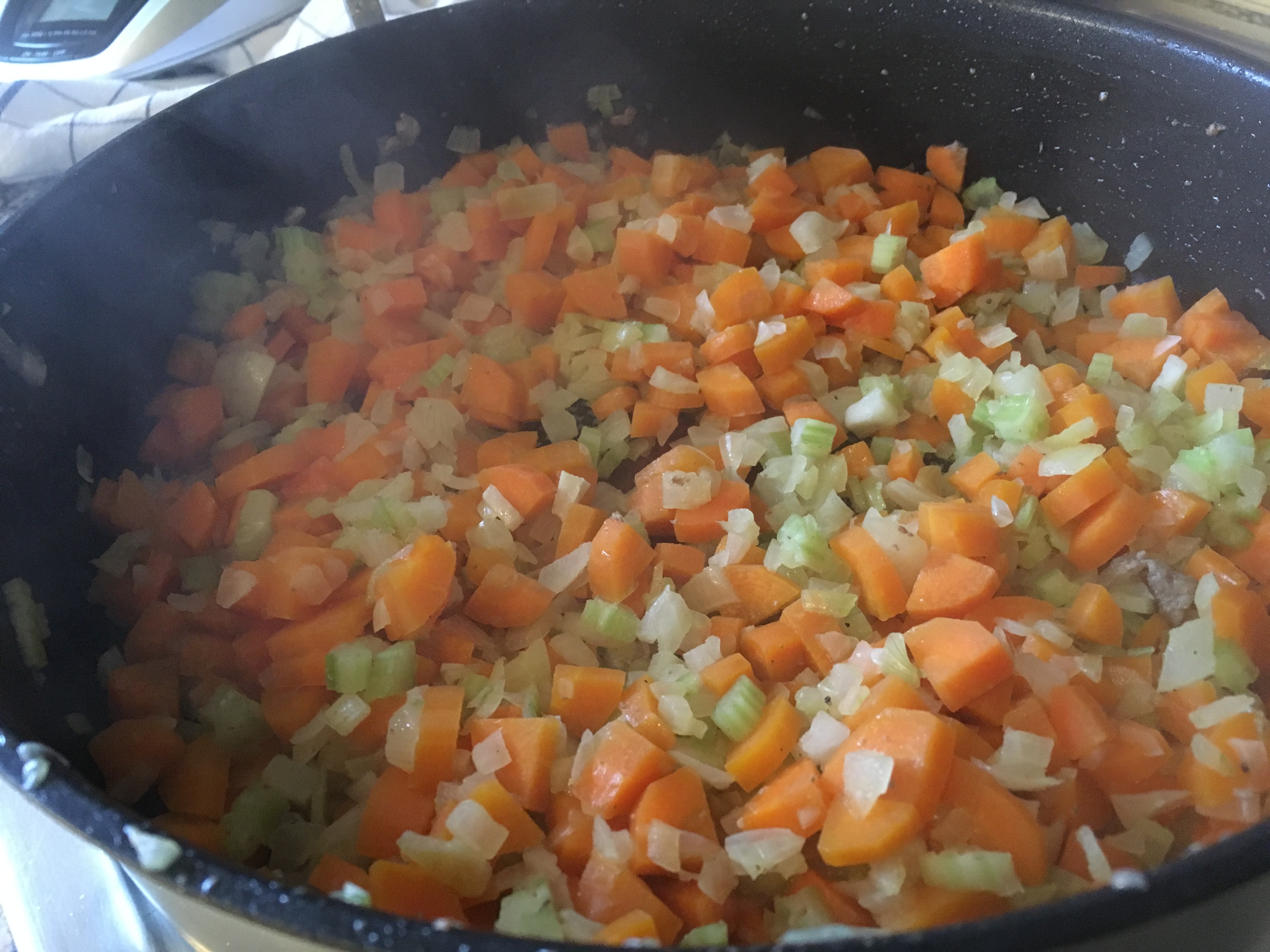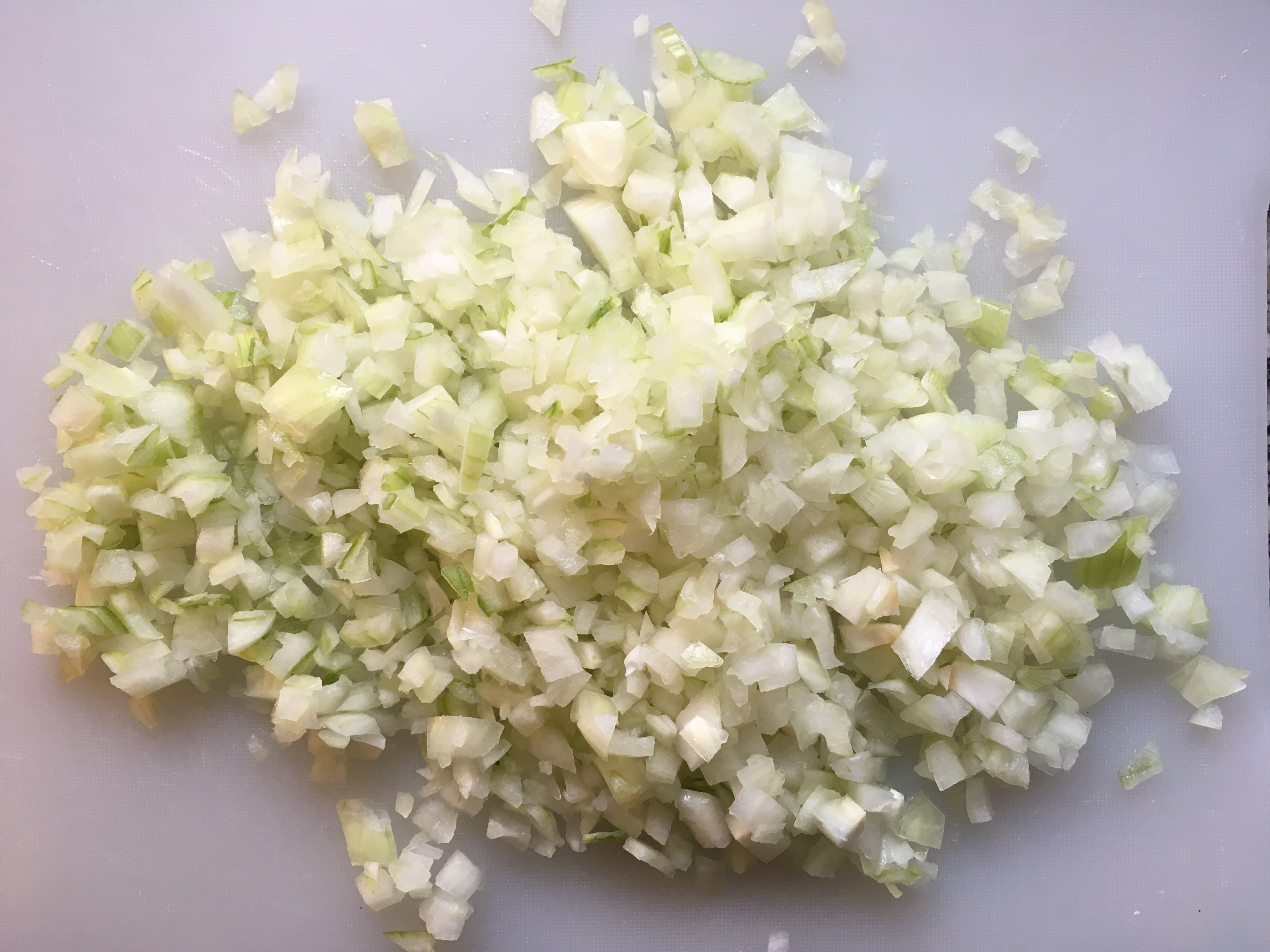 - Die Zwiebeln, Karotten und den Staudensellerie schäle ich und schneide das Gemüse anschließend in kleine Würfel.