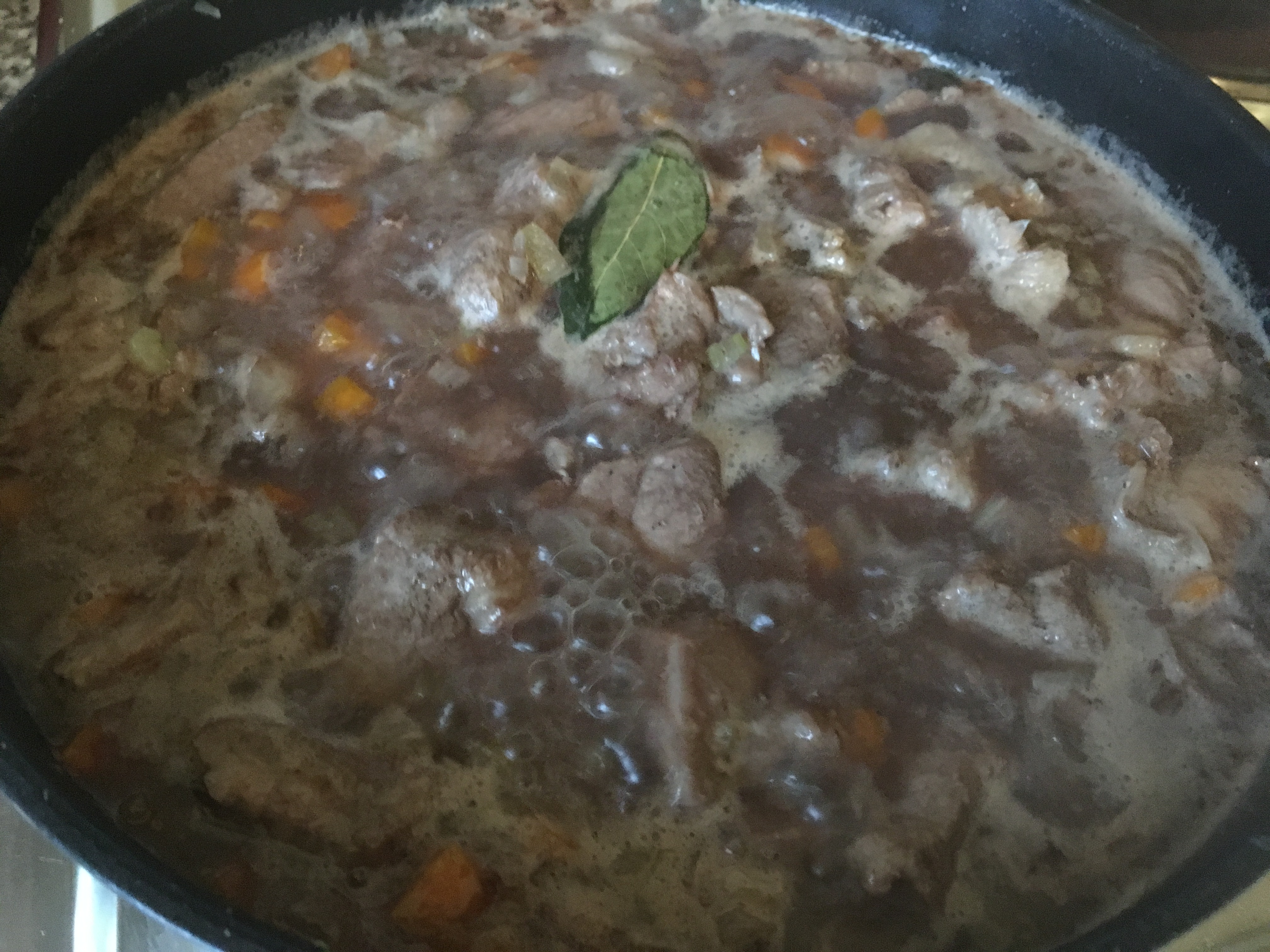 - Das Lorbeerblatt füge ich hinzu und lasse das Stew auf mittlerer Hitze ein paar Minuten köcheln.
