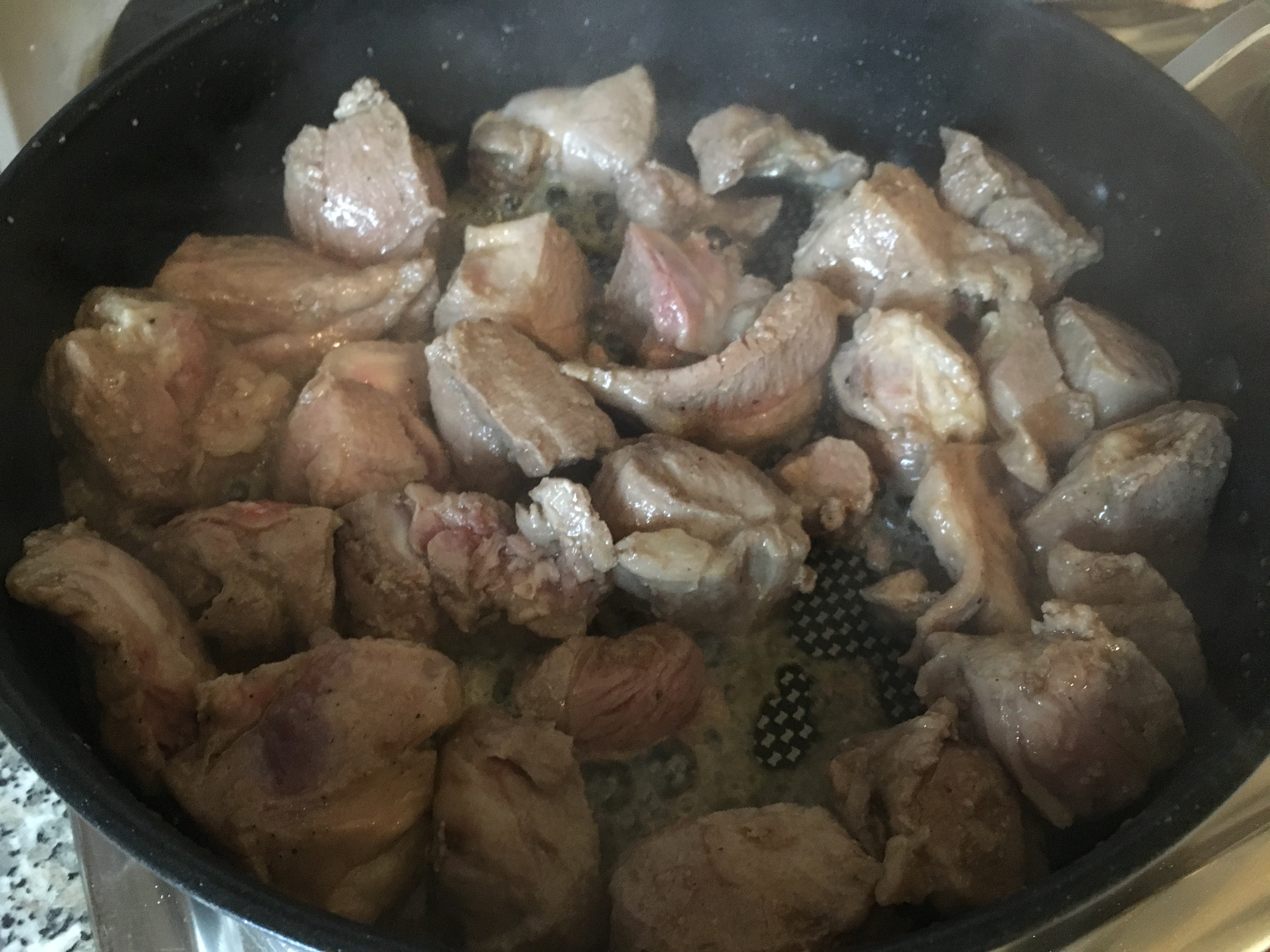 Lamm anbraten Lamm angebraten - Sobald das Fleisch eine schöne Färbung angenommen hat, lege ich es auf einen separaten Teller und brate das vorbereitete Gemüse im Bräter an.