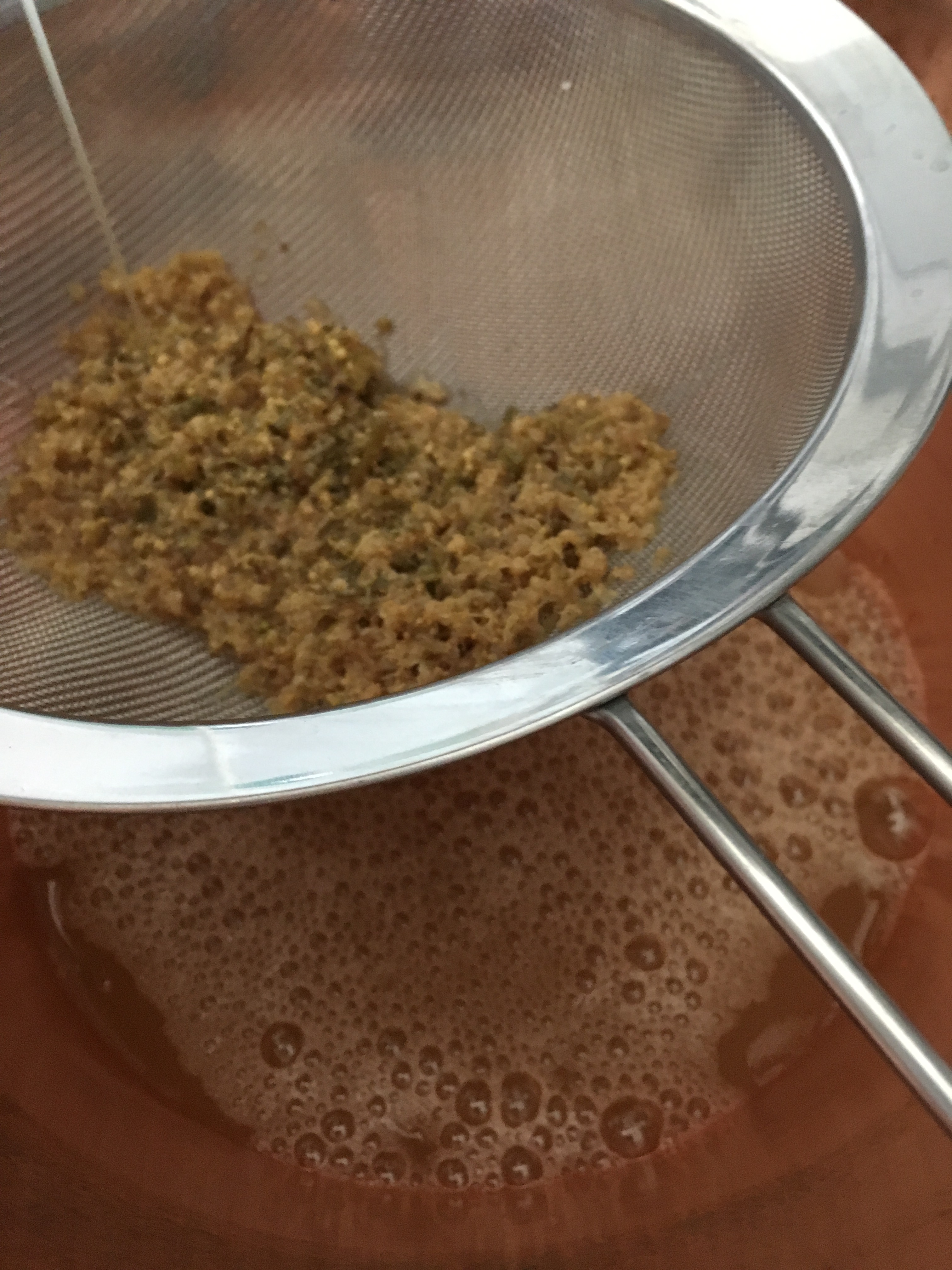 - 1300ml des Saftes durch ein Sieb in einen großen Topf schütten. (Den Rest entweder gleich trinken oder eine leckere Schorle mit eiskaltem Wasser damit zubereiten – himmlisch!)