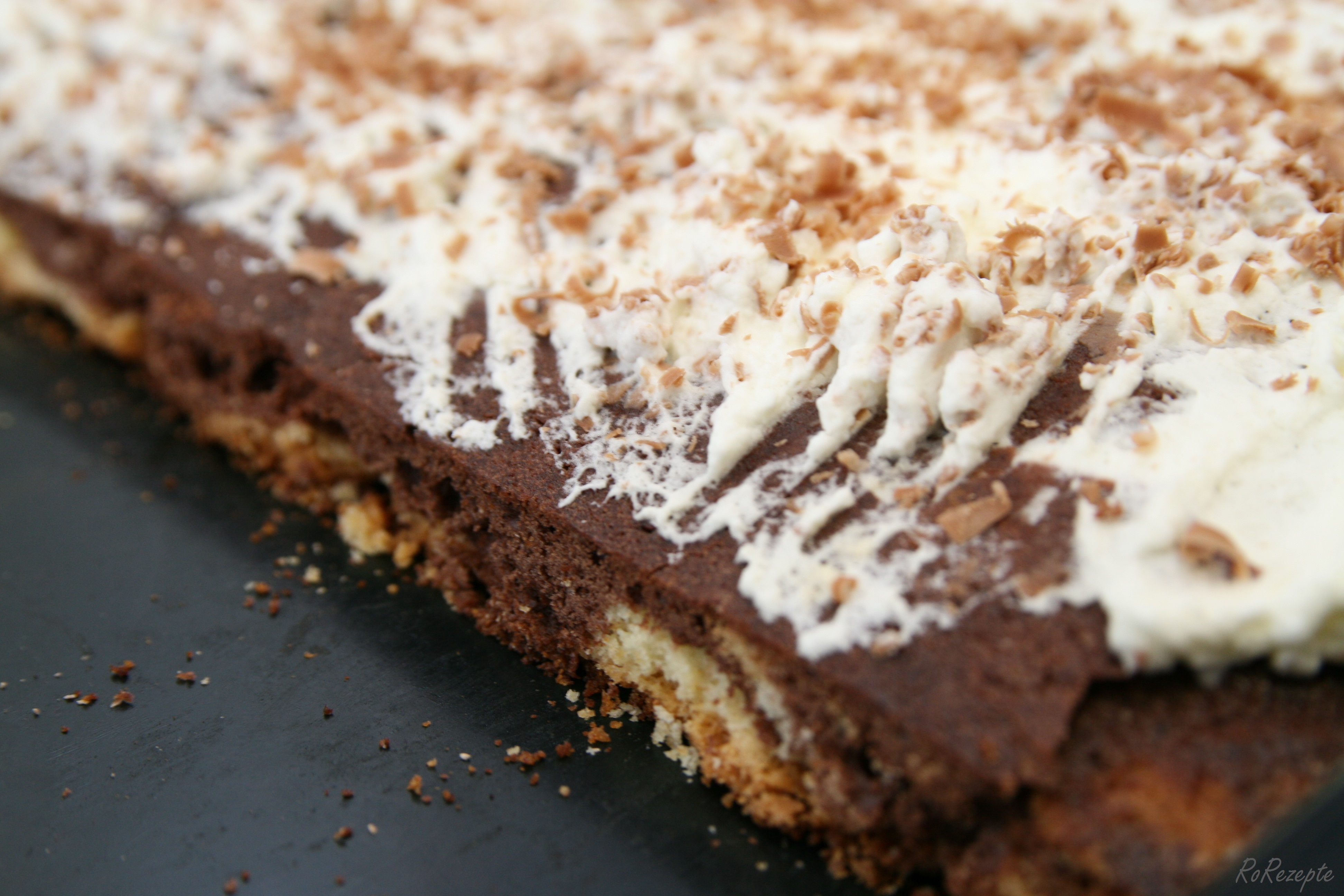 Teig halbieren Kakaopulver zugeben - Die andere Hälfte auf einem gefetteten Backblech verteilen. Darüber dann den Teig mit dem Kakao geben.