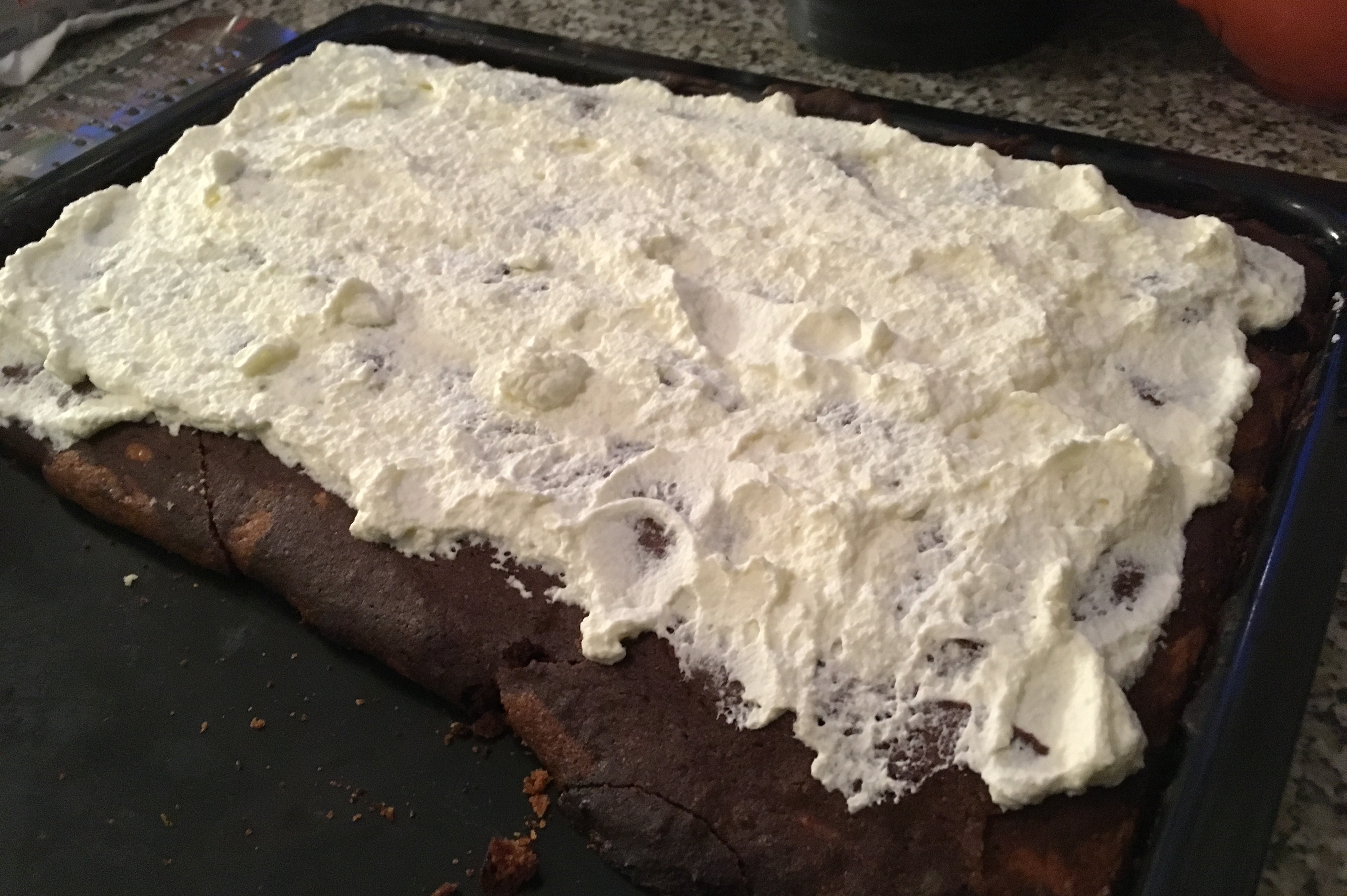 Sahne schlagen Sahne verteilen Sahne verteilen - Schokoraspel darüberstreuen und anschließend mit Hilfe einer Gabel Wellenlinien ziehen. Wellenlinien sind eher schwer zu ziehen, aber es geht auch ohne 🙂 Die Raspel hat man bei meiner Menge nicht wirklich geschmeckt, zumal Milka auch nicht zu Kakaopulver passte… naja 🙂 Also hier eher eine Zartbittervariante und je nach Lust, mehr oder weniger Raspeln.