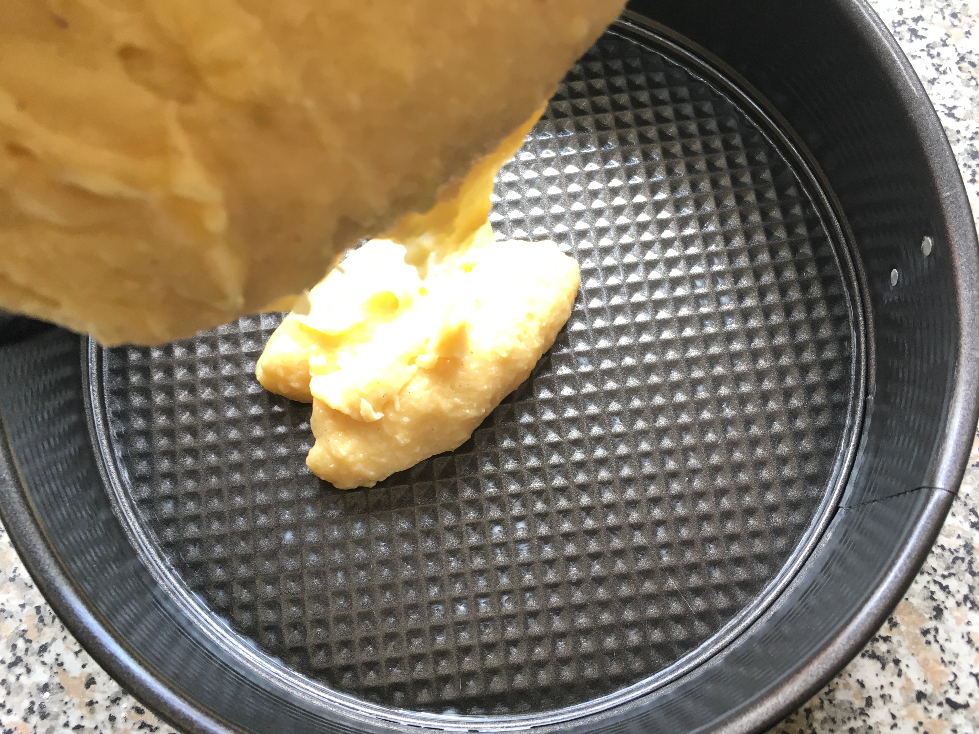 Mehl zufügen Mehl unterrühren Kuchenteig - Eine Backform (Springform 26cm) buttern. Den Teig gleichmäßig in die Form geben.