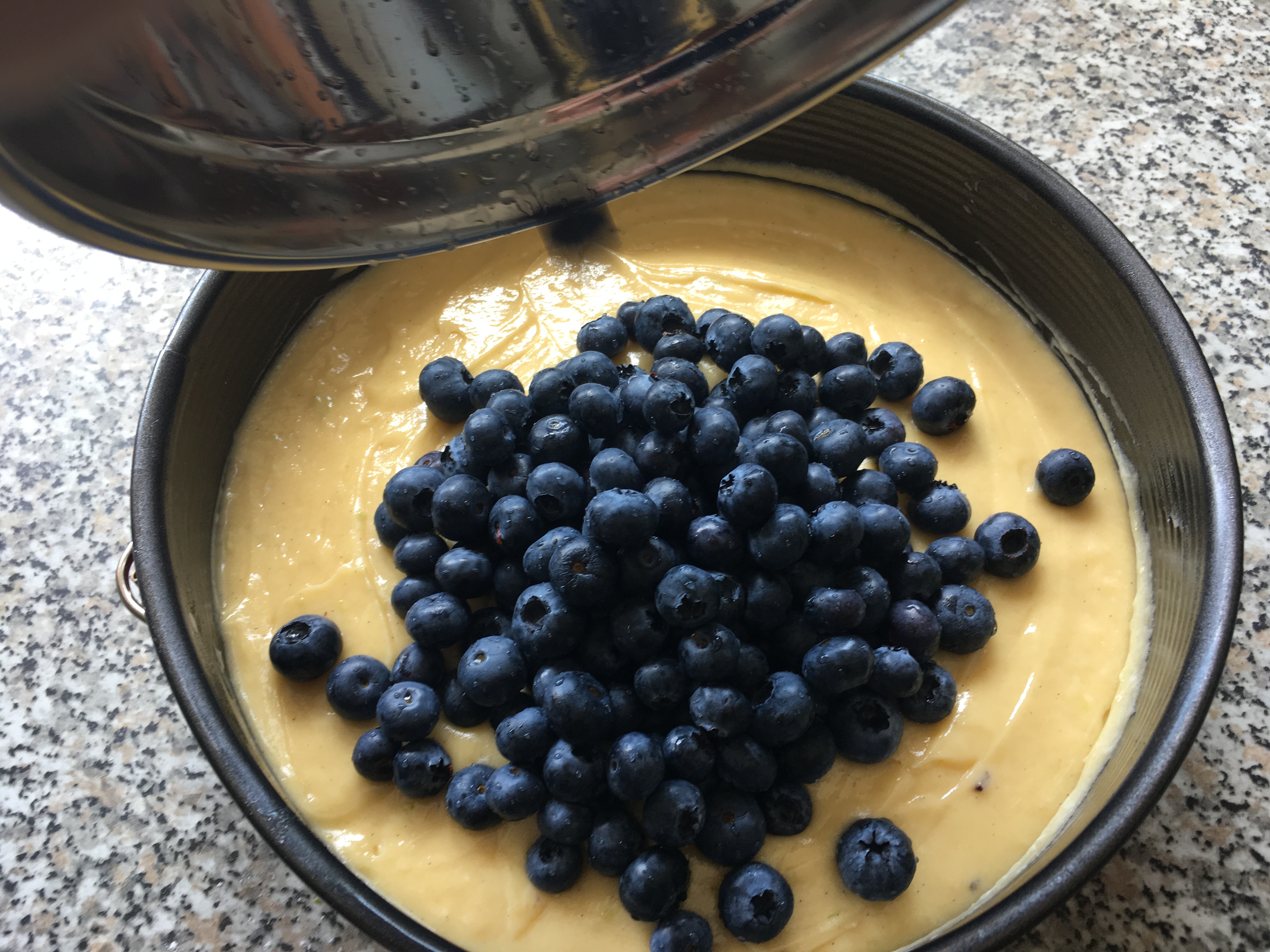 Backform füllen Backform gefüllt - Die Blaubeeren waschen und vorsichtig trocken. Nun die Beeren über den Teig geben und nur ein wenig „hineindrücken“.