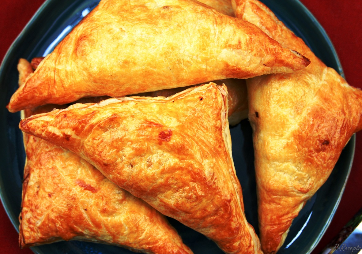 Blätterteig schneiden, mit Eigelb bestreichen - In der Mitte geben Sie so viel von der gewünschten Fülle, dass Sie das Teigstück danach noch diagonal zu einem Dreieck zusammenklappen können. Die Dreieicke werden nochmals mit Ei bestrichen. Dann legen Sie die Teigdreiecke auf das Backblech und lassen sie einige Zeit rasten (20 Minuten).