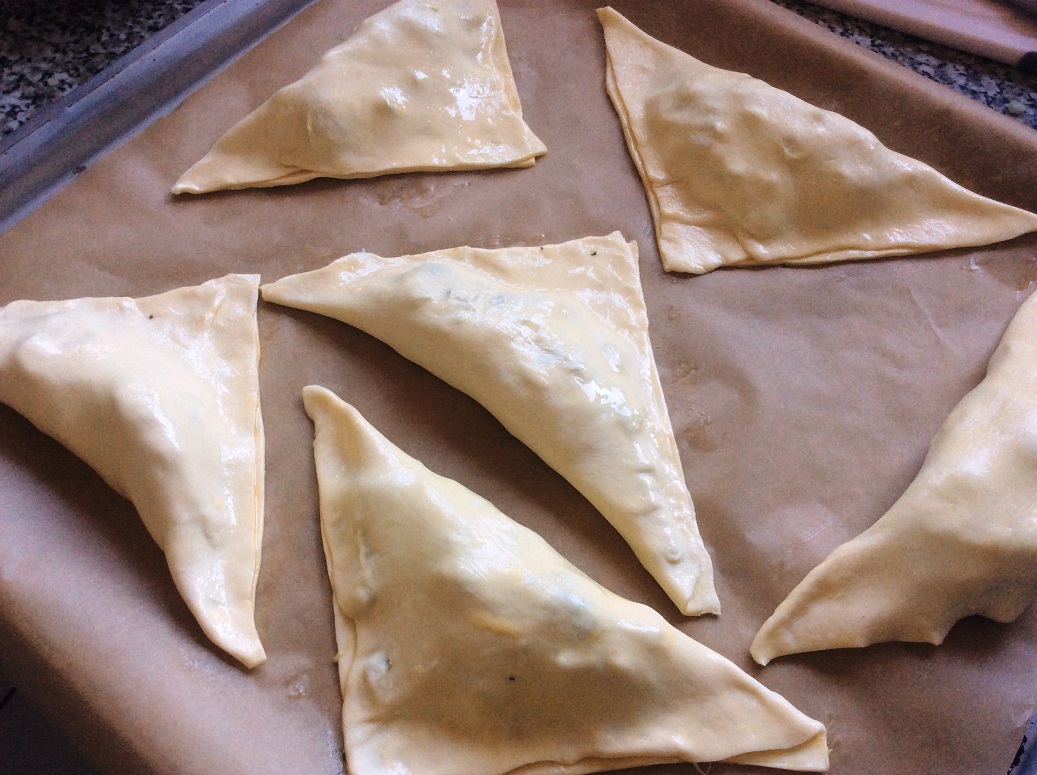Füllung, gefaltet, bestrichen - Dann bei 200 Grad rasch anbacken, bis der Teig Farbe annimmt. Danach mit der Temperatur zurückgehen und die Dreiecke gut durchbacken lassen.