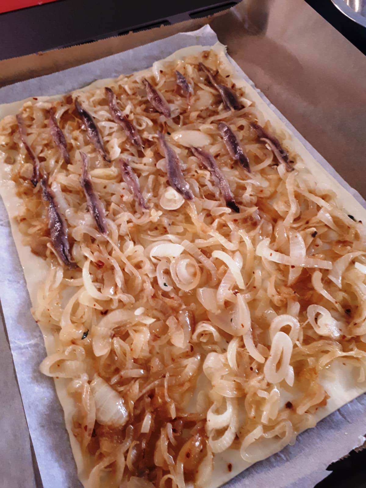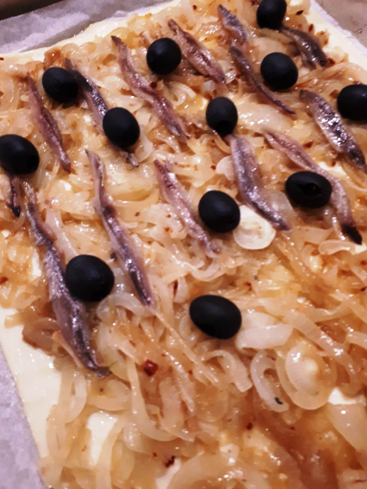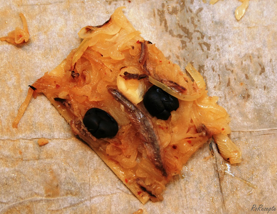 Teig ausrollen - mit der Gabel einstechen und mit Olivenöl bestreichen. Die Zwiebelmischung, Sardellenfilets und Oliven darauf verteilen und unter Beobachtung für zehn Minuten im Ofen knusprig backen.