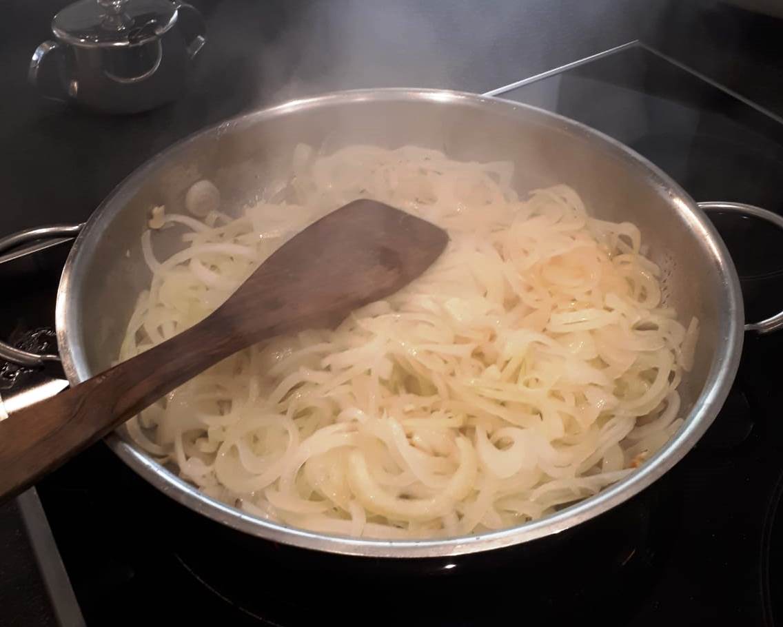 Zwiebeln glasig schmoren, Gewürze zugeben - Fisch abtropfen lassen und mit lauwarmen Wasser abspülen, um den Salzgehalt etwas zu reduzieren. Dickere Sardellen der Länge nach durchschneiden, die Oliven halbieren.