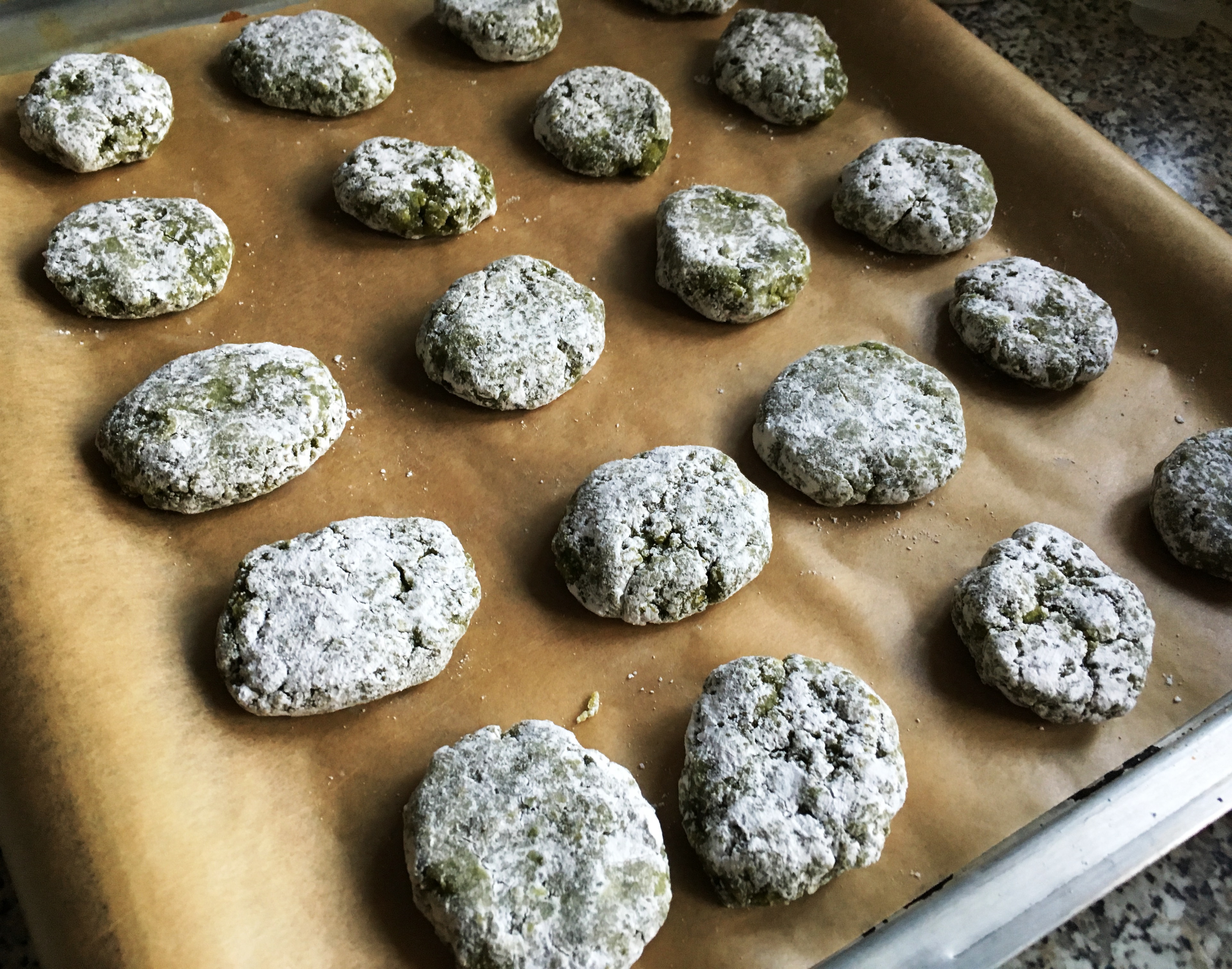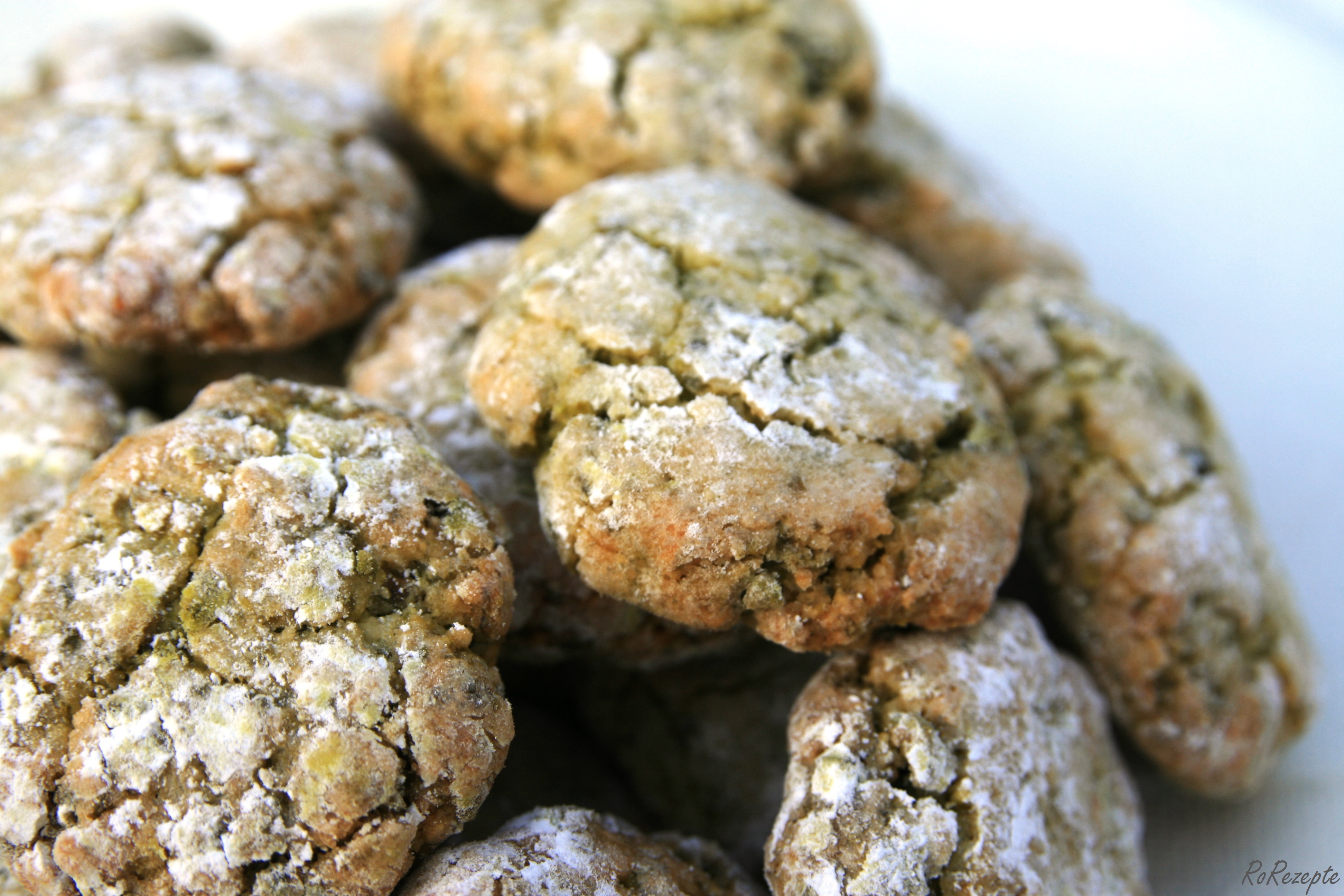 Das Gebäck ist außen leicht kross und innen einfach nur fluffig pistazig. Die Taler schmecken richtig richtig gut, zergehen auf der Zunge und als Pistazienfan sind die Wölkchen zum “drin rumwälzen”. Das Rezept ist super einfach. Und auch wenn die Pistazien sehr teuer sind, es lohnt sich! Ich habe meine Wölkchen noch immer in einer luftdichten Dose und sind jedes Mal, wenn ich mir eins mopse, noch genauso lecker wie am Anfang.