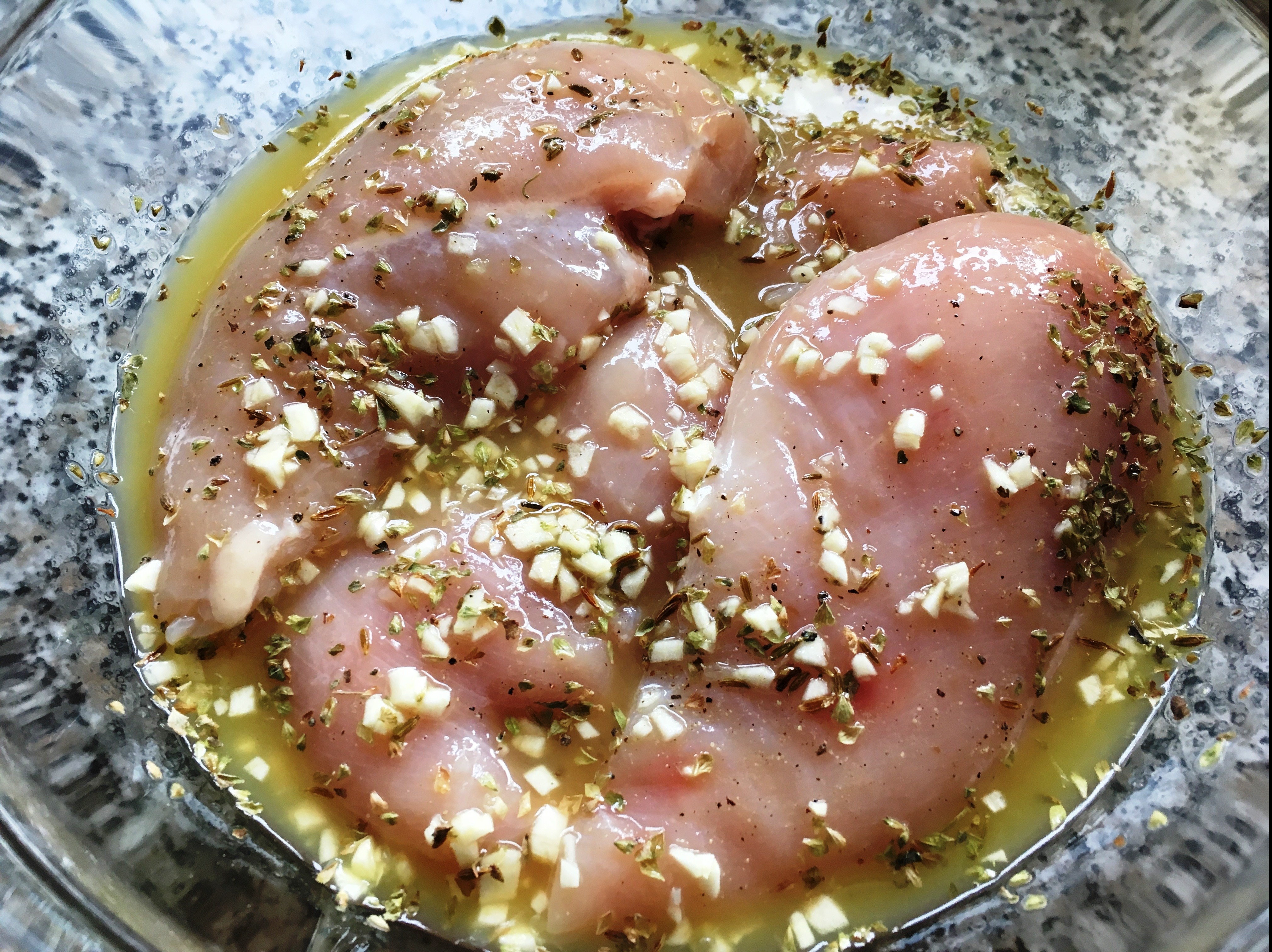 - Die Hähnchenfilets in eine große Schüssel legen. Knoblauch, Salz, Pfeffer, Oregano, Kreuzkümmel und den Saft zu einer Marinade verrühren, über das Hähnchenfleisch gießen, mit Zwiebelringen bedecken und mindestens zwei Stunden ziehen lassen, gelegentlich wenden.