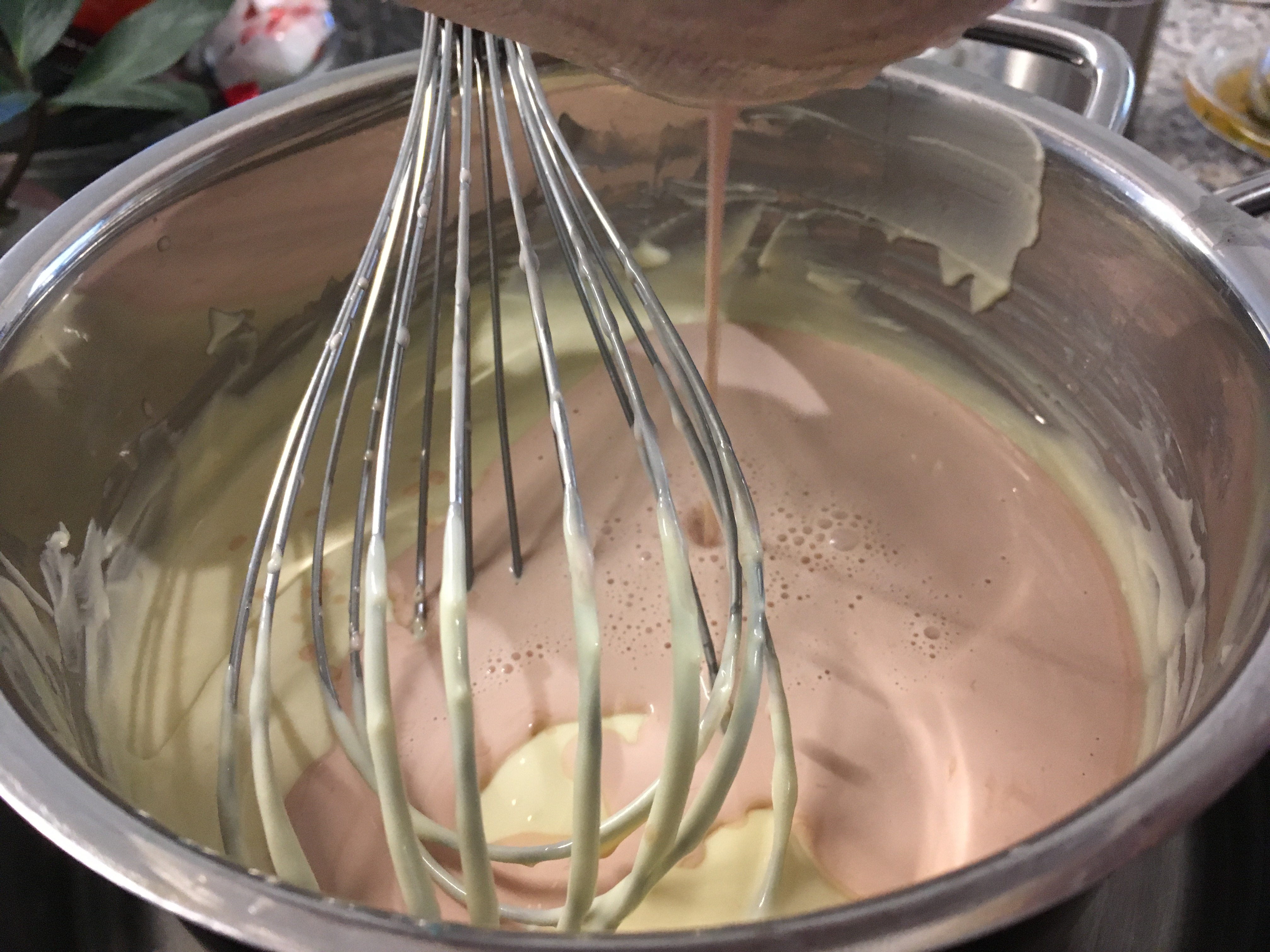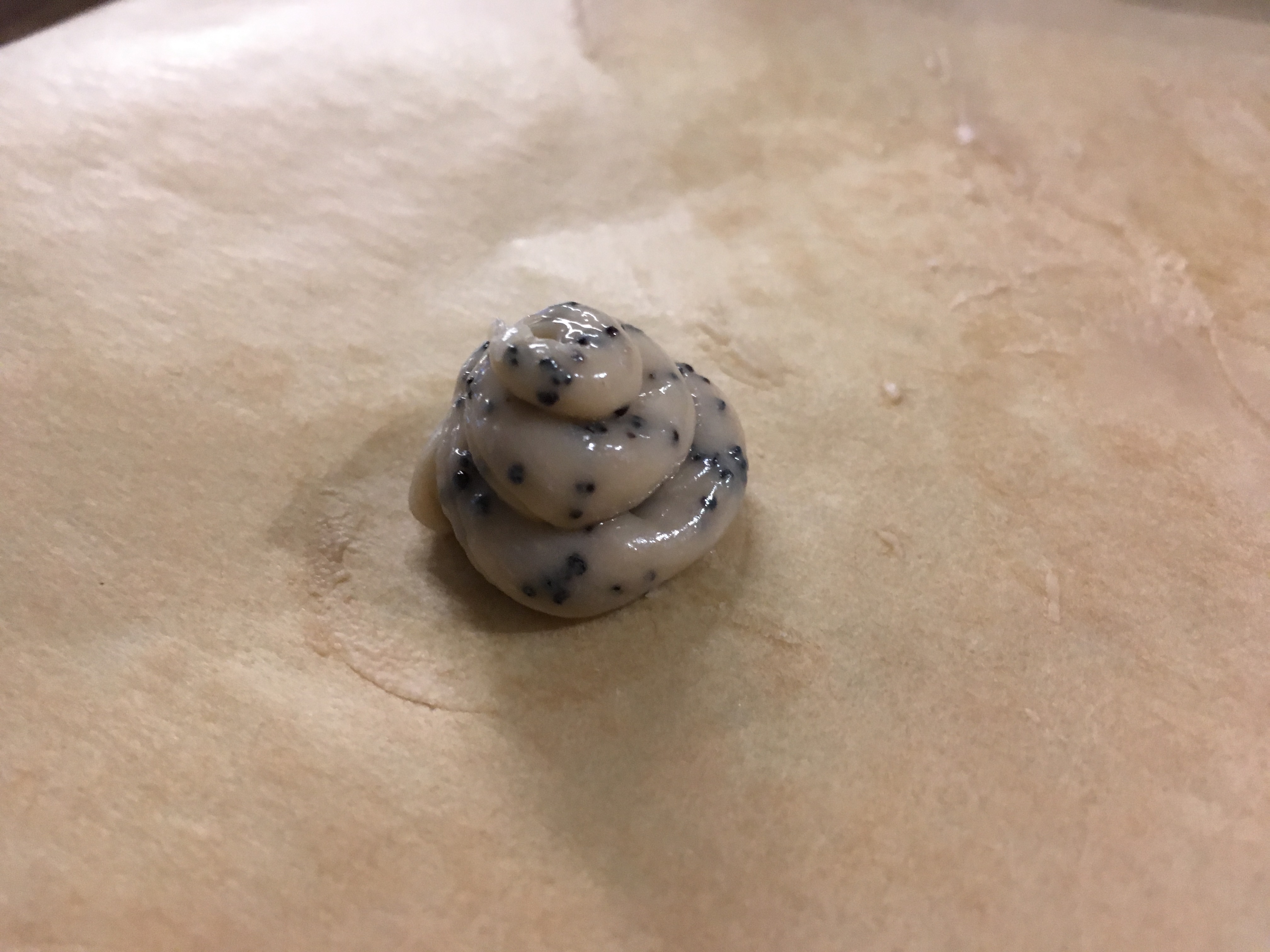 Mohn - 300g weiße Kuvertüre schmelzen und mit der Heu-Mohn-Sahne zu einer homogenen Masse verrühren.