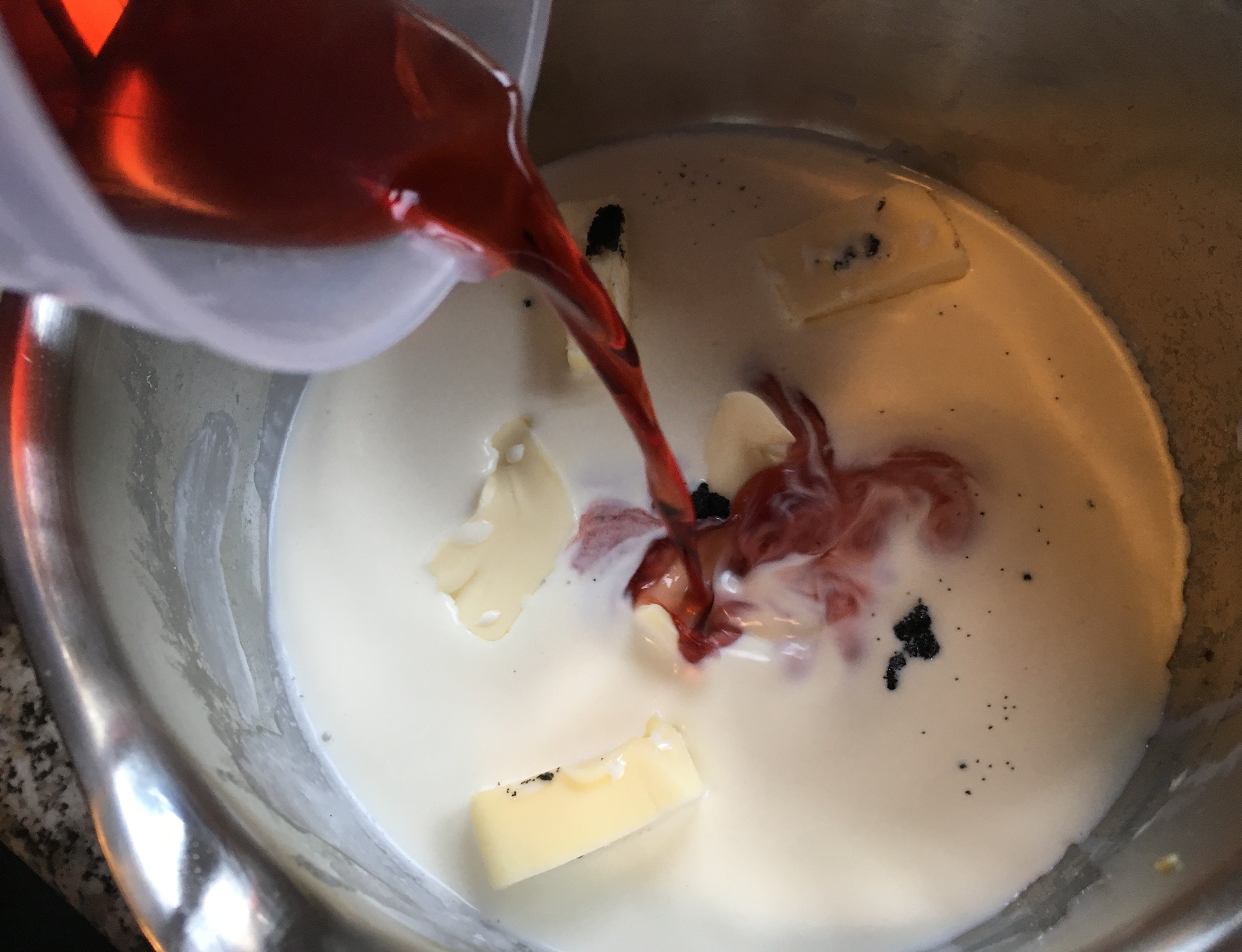 2. 100g Sahne mit dem Mark einer Vanilleschote, 20g Butter und 25ml Sherry kurz erhitzen