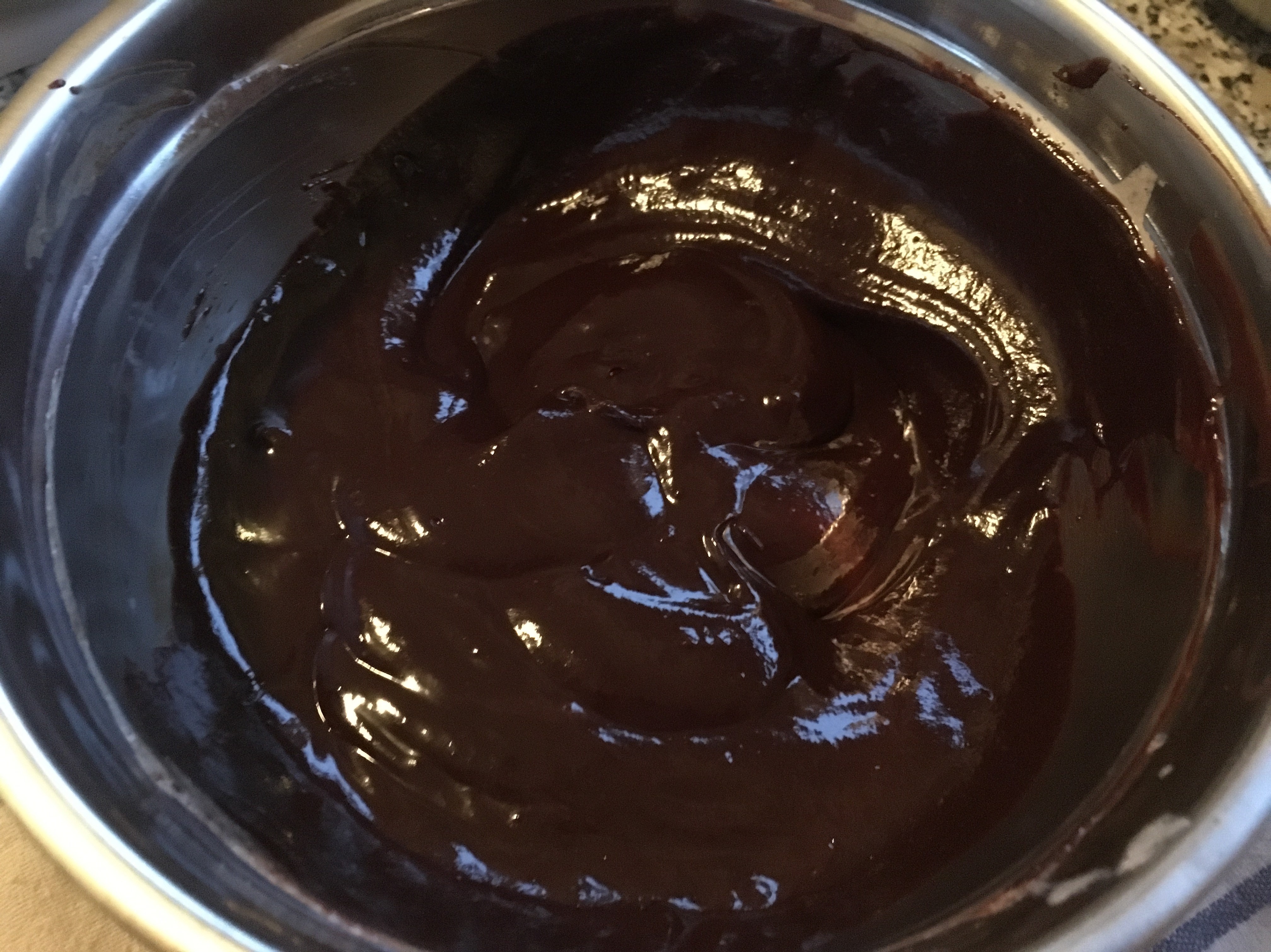 3. und durch ein Sieb zur geschmolzenen Kuvertüre rühren. Ich habe nicht verstanden warum? Es gab nichts zum herausfiltern. Daher kann dieser Schritt weggelassen werden. Ich empfehle hier ein stückweise unterrühren in die geschmolzene Kuvertüre – Achtung Stockgefahr, wenn die Mischung noch zu heiß ist.