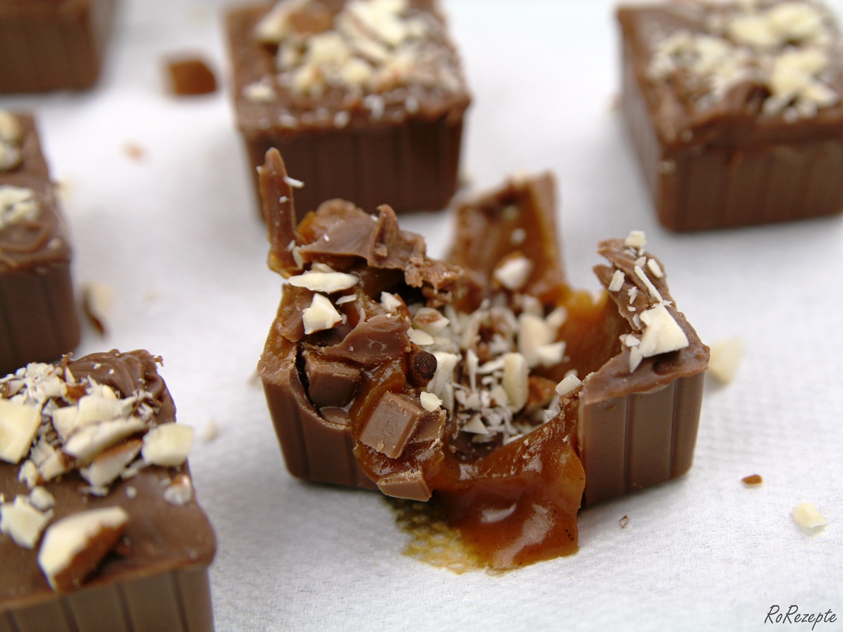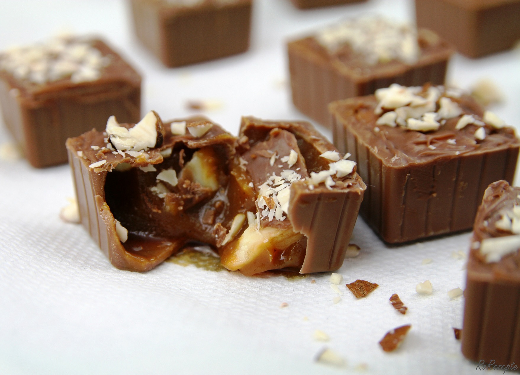 weiße Schokolade bestreichen - 200g Zartbitter oder Vollmilch-Kuvertüre schmelzen und die Pralinen komplett verschließen. Mit gehackten Mandeln bestreuen. Alternativ könnt ihr die gehackten Mandeln kurz anrösten und auch in das Karamell geben.