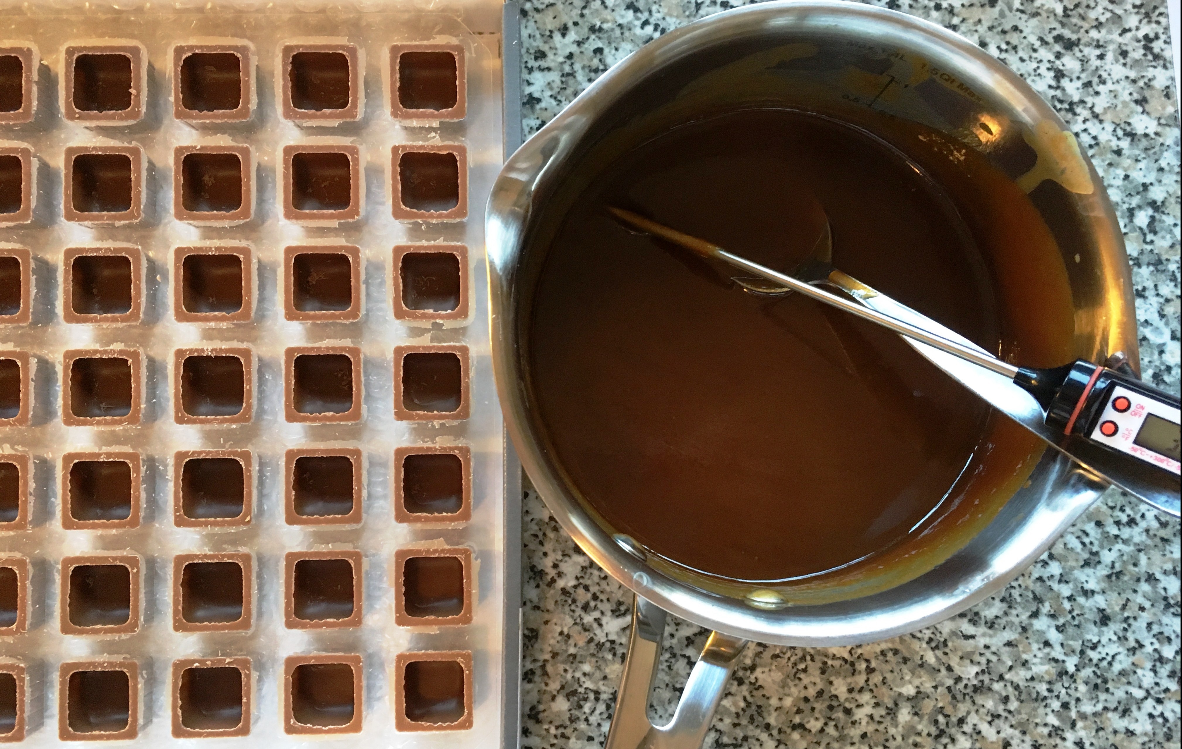 - 20 quadratische Pralinen-Hohlkörper (Zartbitter oder Vollmilch) mit dem abgekühlten (ca. 30 Grad, max. 34 Grad nach ca. 30 Minuten) Karamell füllen – nicht ganz bis zum Rand.