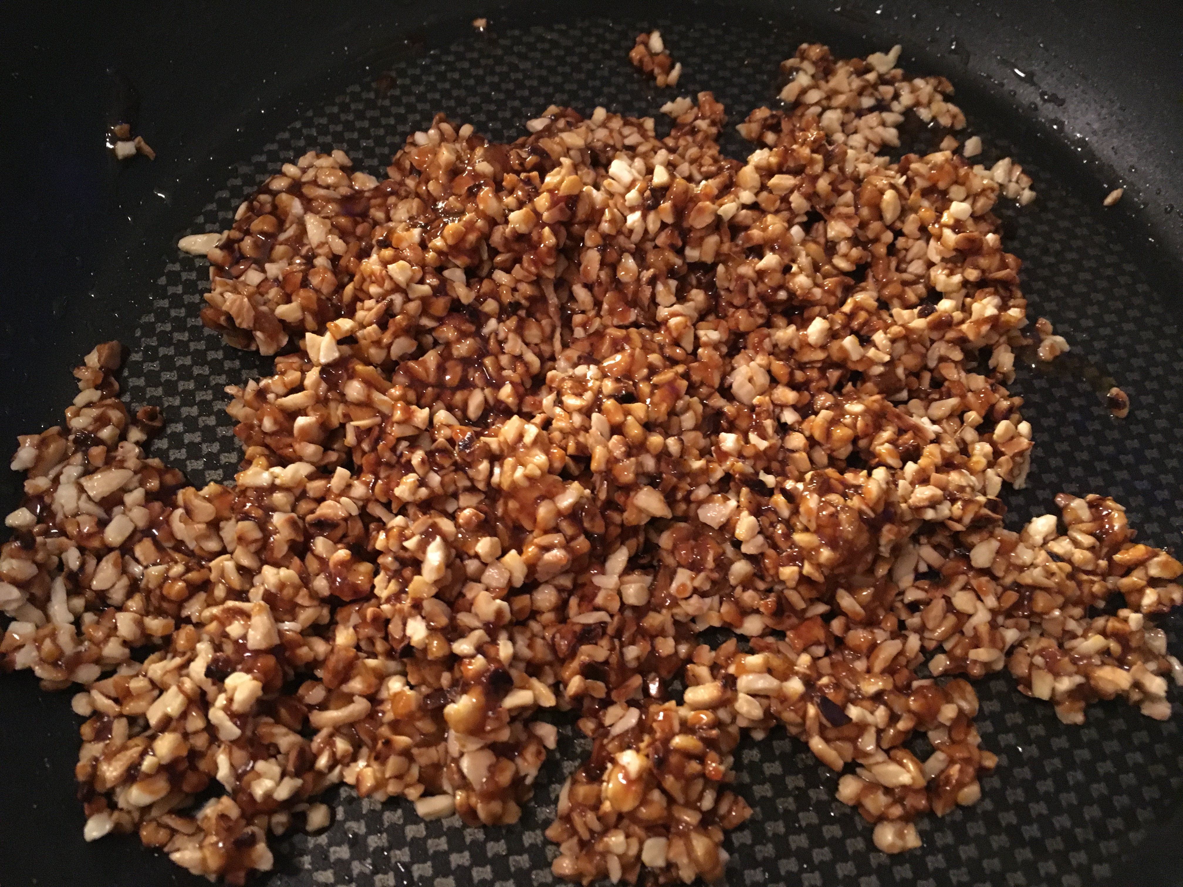gehackte Mandeln rösten - Die Butter und den Zucker in die Pfanne geben und schmelzen lassen, bis die Masse karamellbraun ist. Vom Herd nehmen,