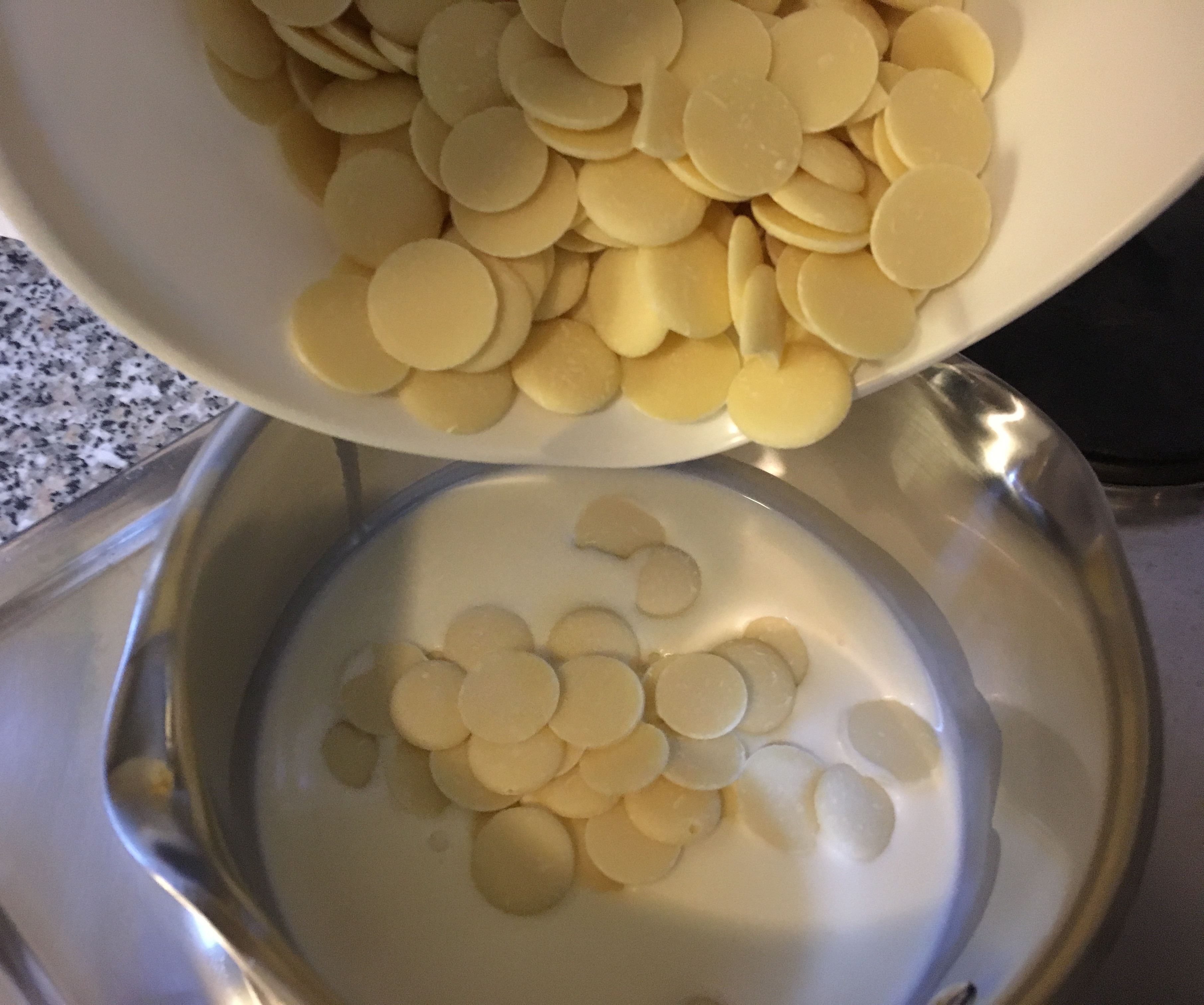Sahne erwärmen, Kuvertüre stückweise zugeben Schmelzen, verrühren Masse kühlen - Die Masse in eine Rührschüssel umfüllen und für 2 Stunden in den Kühlschrank stellen.