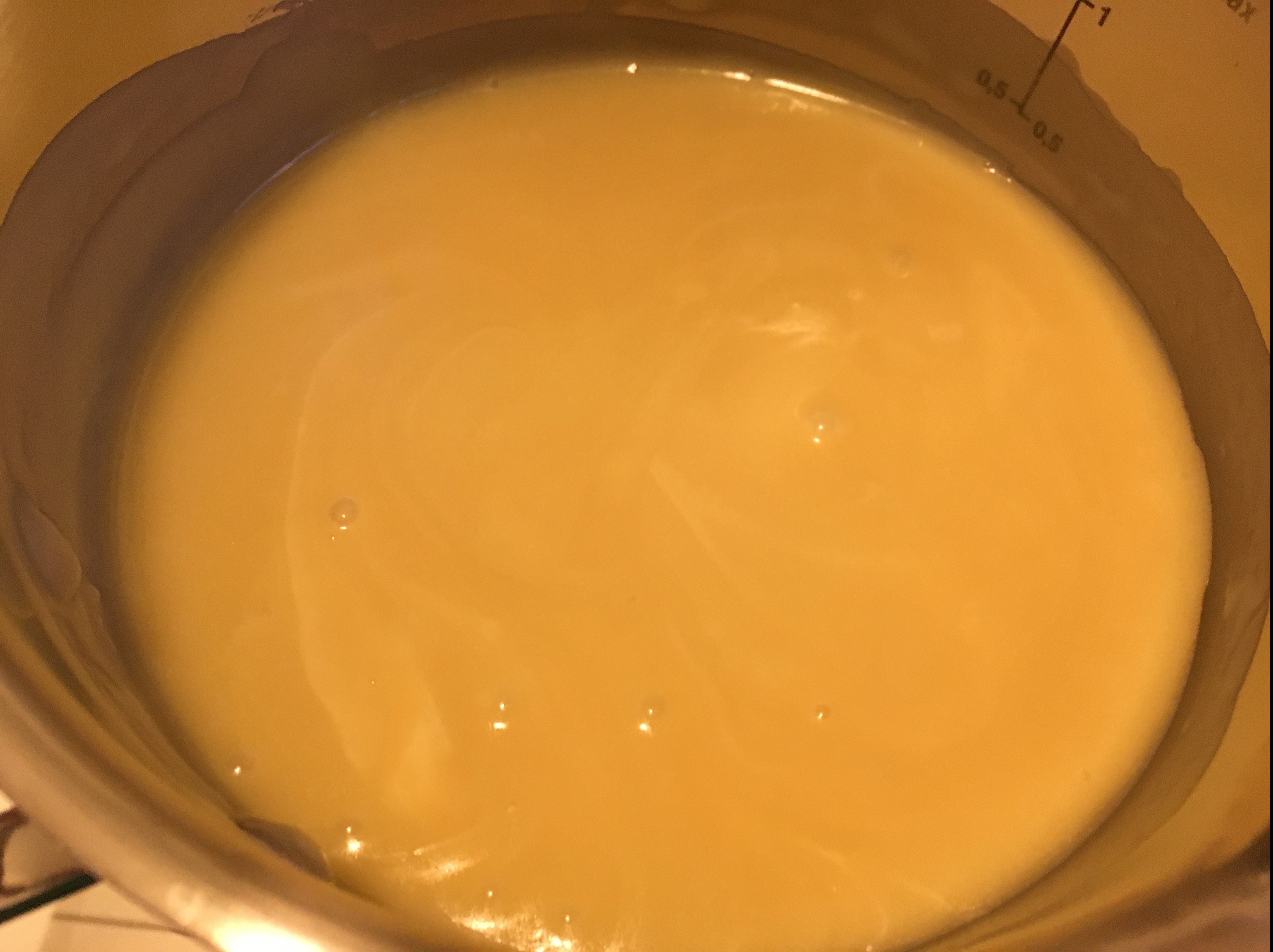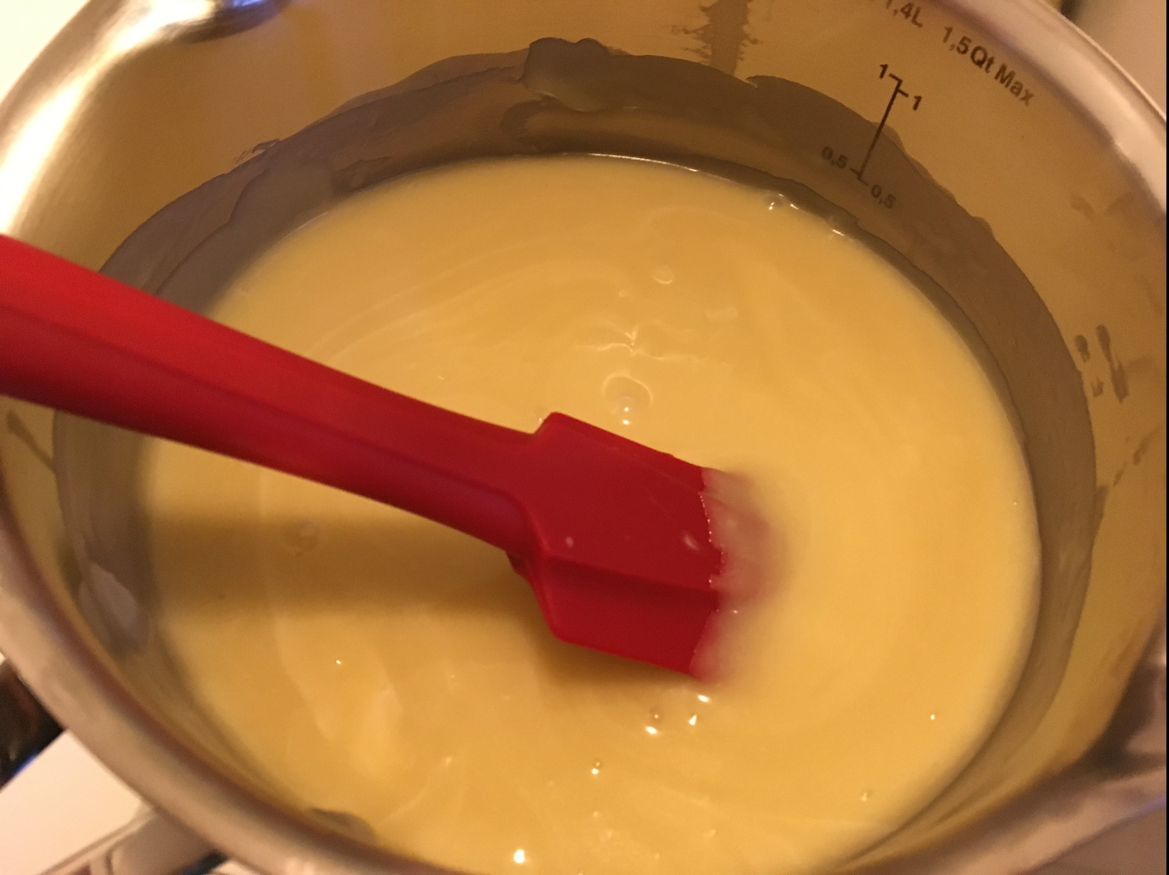 - Die Kuvertüre stückweise wirklich!! hinzugeben und langsam schmelzen lassen. Dabei fleißig rühren.