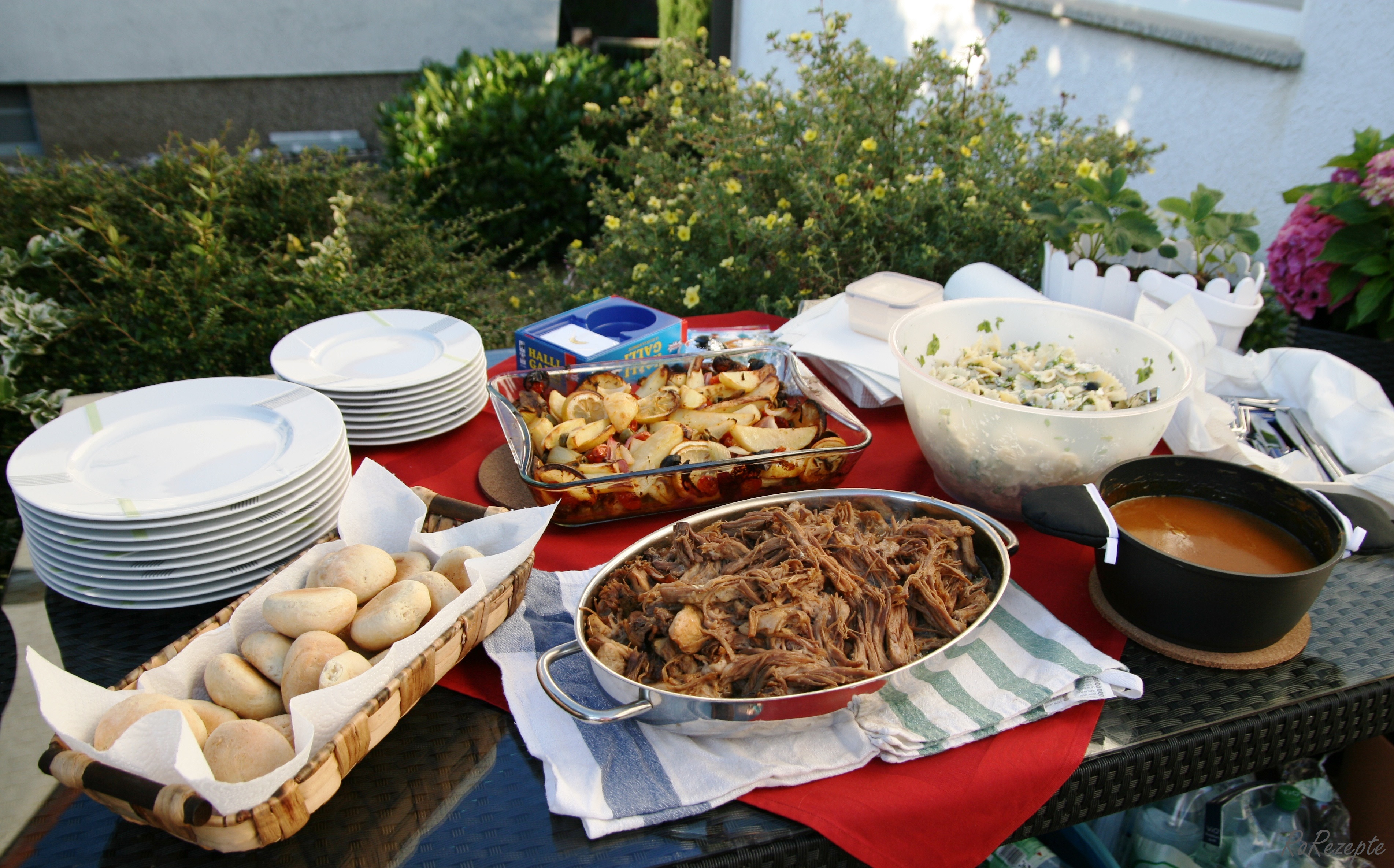 Serviert wurde neben einer frischen Sommerbowle zu erst eine Apfeltarte und den allercoolsten Schokoladenkuchen mit Erdnussbutterglasur. Zum Abend wurde dann richtig aufgetischt: Zupfbratensandwichs ala Pulled Pork mit selbstgebackenen Brötchen, sowie Tapsis Ofenkartoffeln und einem griechischen Nudelsalat.