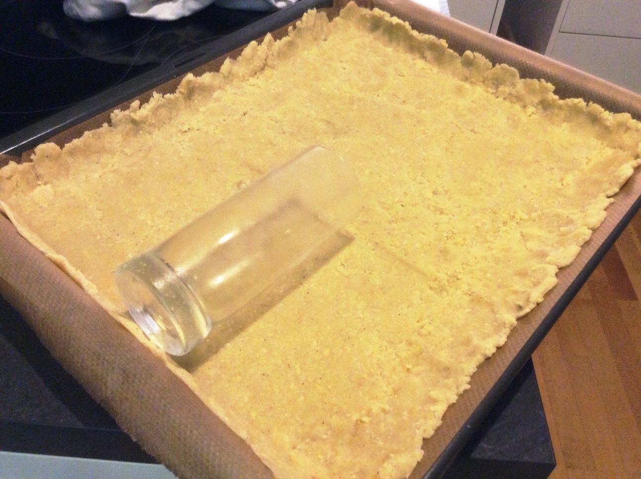 - Alle Zutaten für den Teig / die Streusel in eine Schüssel geben und mit dem Handmixer verrühren. Die Hälfte des Teiges auf das Backblech geben und mit den Händen zu einem flachen Boden andrücken, anschließend mit der Teigrolle glatt rollen. Wer keine Teigrolle hat, nimmt einfach ein Glas. Ich muss ja sagen, der Glastipp war ultimativ! Warum ich darauf noch nie gekommen bin?…