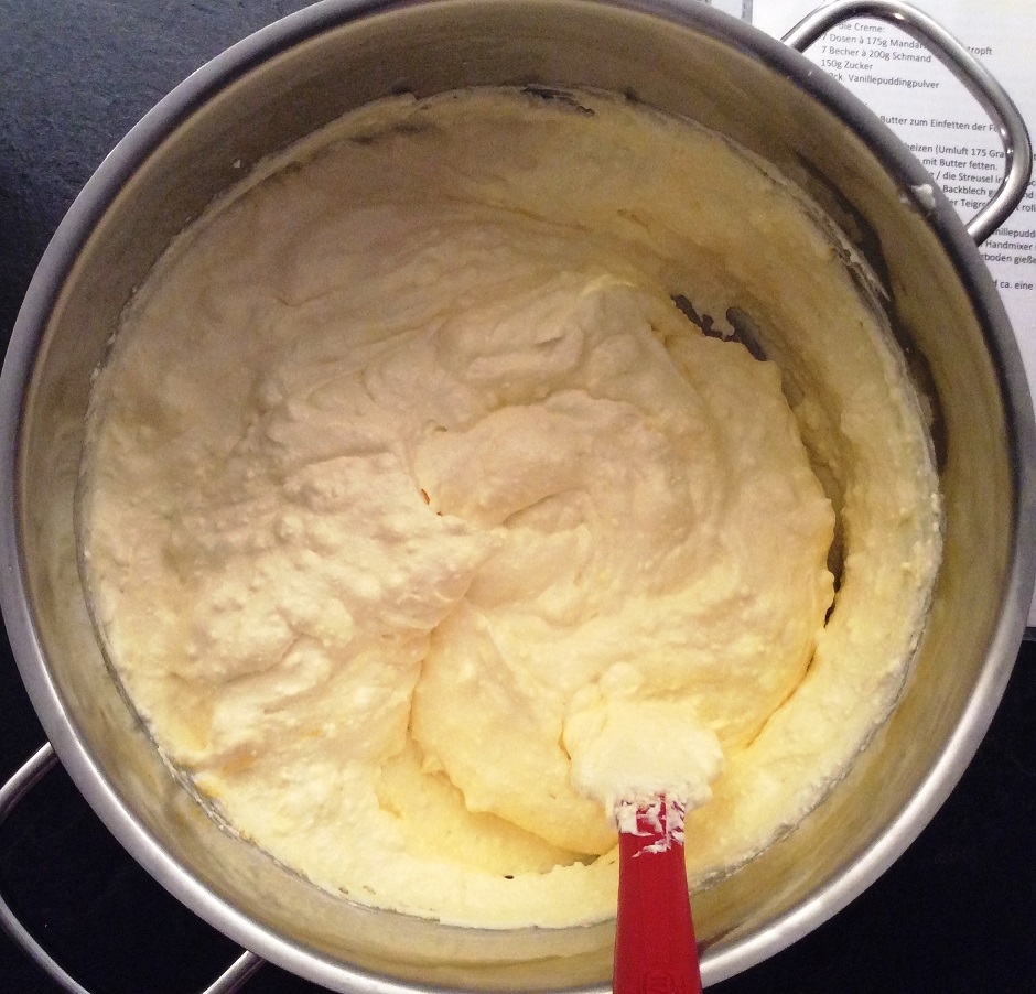 Zutaten Creme Mandarinen unterrühren - Die fertige Creme auf den Teigboden gießen. Zum Schluss den restlichen Teig als Streusel auf den Belag bröseln.