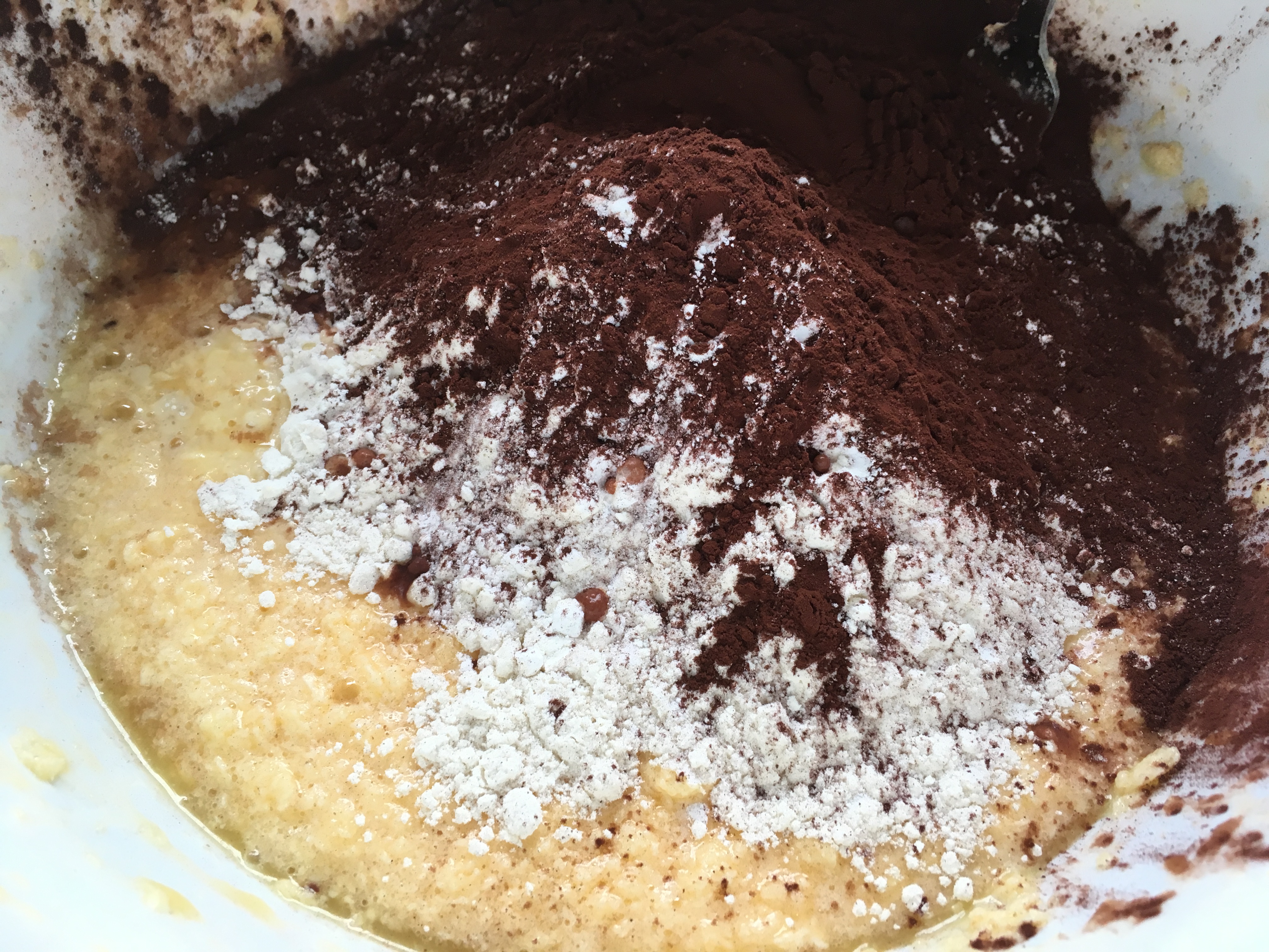 Eier zufügen vermengen - Mehl, Backpulver, Orangensaft und Kakaopulver dazugeben und einen glatten Teig herstellen.