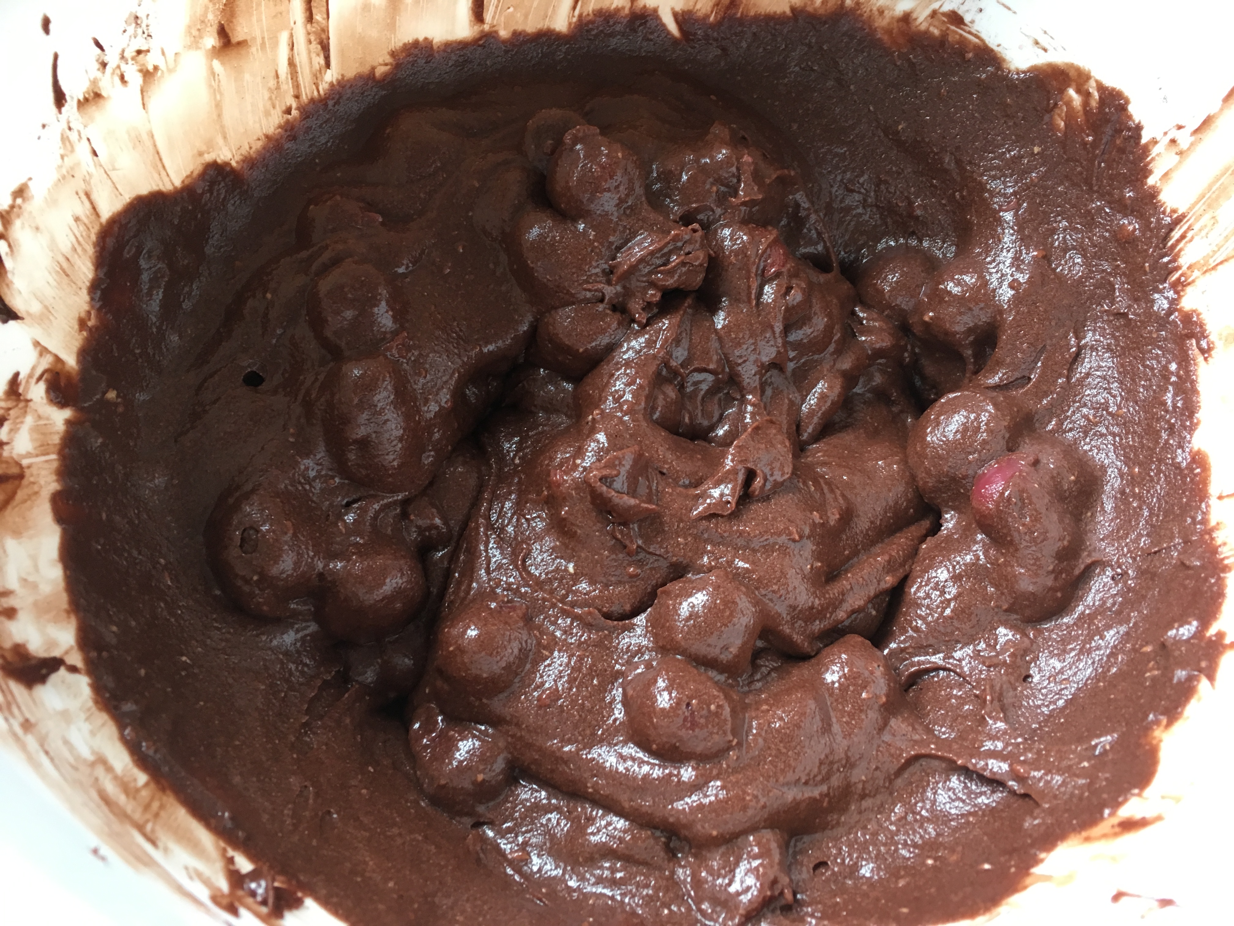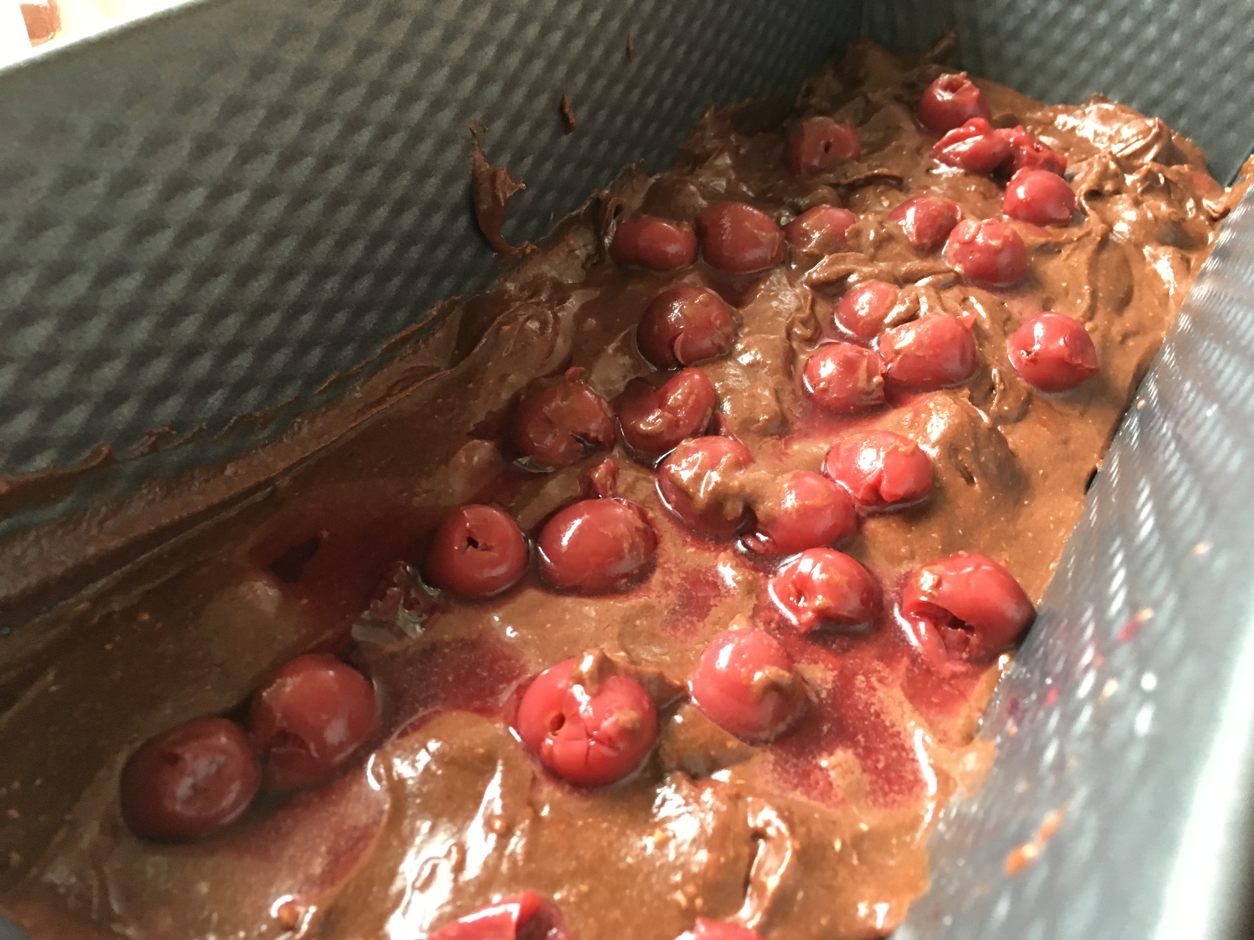 wahlweise Kirschen oder Schokostücke zufügen - Eine Kastenform fetten und den Teig hineingeben. Den Ofen auf 180 Grad Ober-/Unterhitze vorheizen und dann den Kuchen 35 Minuten backen (bitte mit einem Stäbchen testen, ob er durch ist).