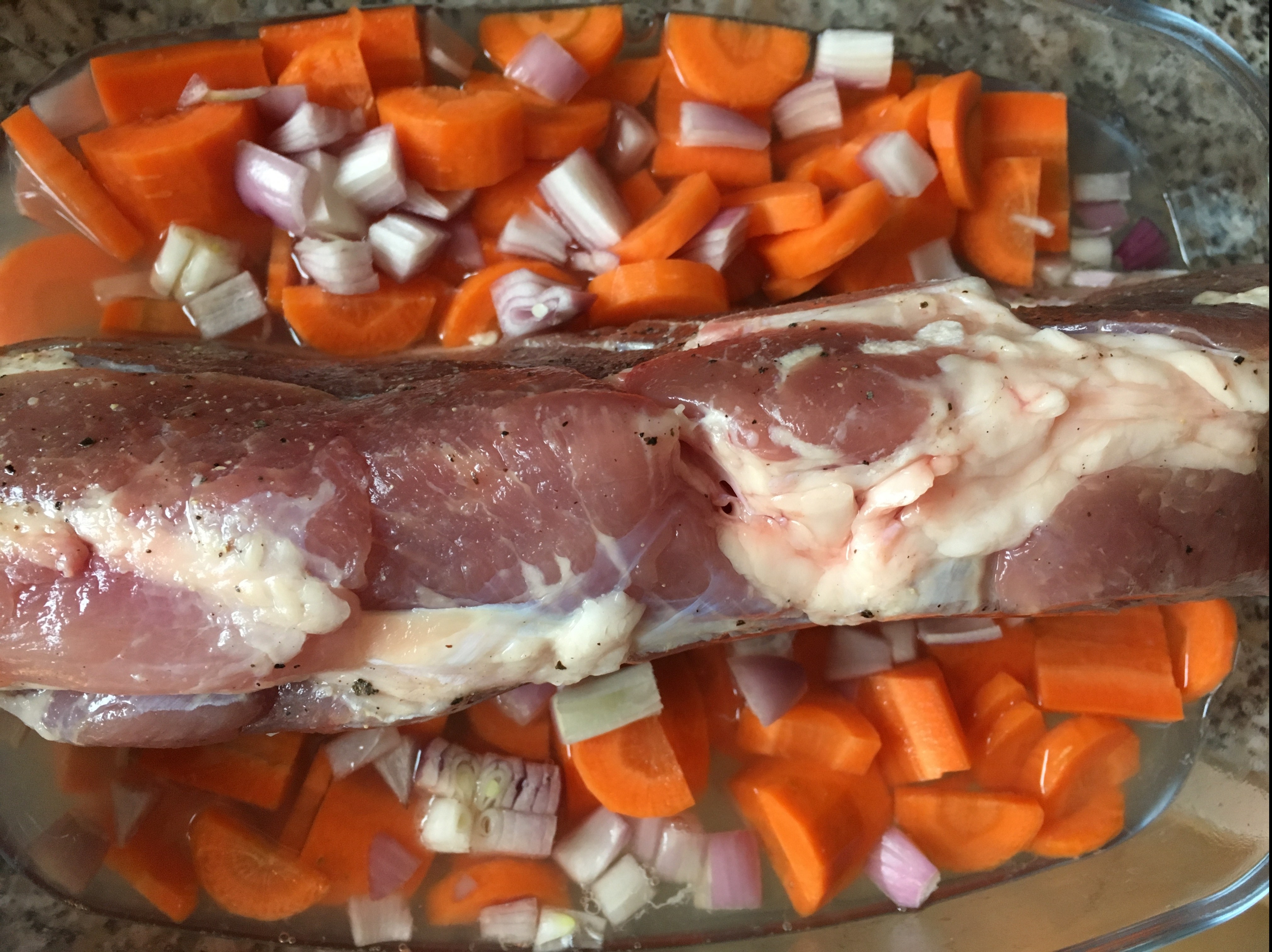 Schweinebraten würzen - Dann gibt man es mit etwas Wasser, jeweils einer fein gehackten Zwiebel und gelben Rübe sowie etwas harter Brotrinde in der Reine ins Bratrohr