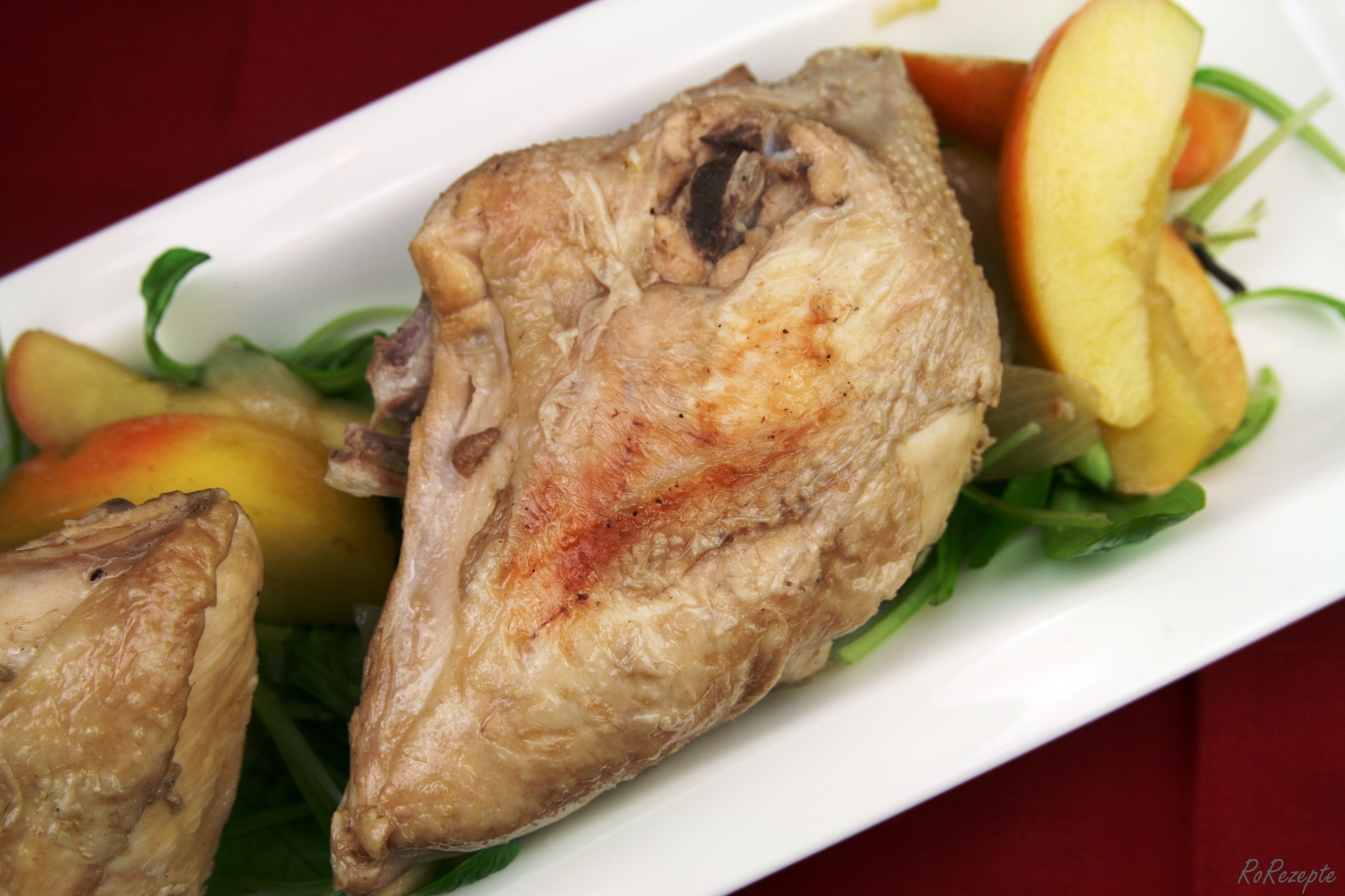 Brühe aufgießen, würzen aufkochen - Die Apfelspalten ca. 5 min vor Beendigung der Bratzeit zufügen und mitschmoren.
