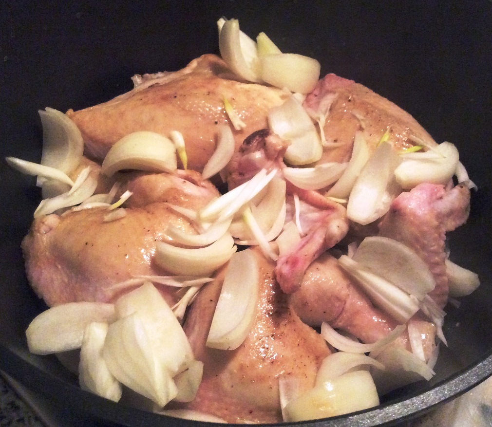 Hühnchen teilen, würzen - In einem großen Bratentopf das Öl erhitzen und das Fleisch darin für ca. 5 min gut Farbe annehmen lassen. Auf der Haut schön kross braten. Nun die Zwiebeln zufügen, ebenfalls kurz anbraten,