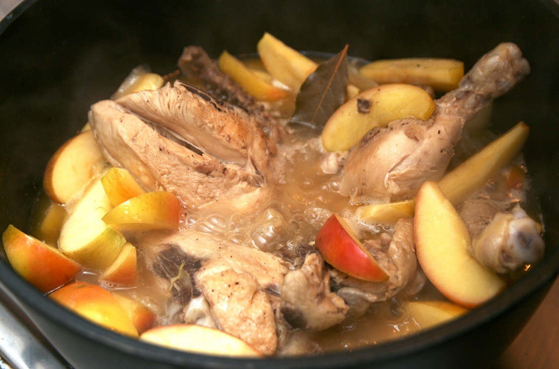anbraten und Zwiebeln zugeben - dann mit Apfelsaft und Geflügelfond aufgießen. Lorbeer, Piment und Nelken beifügen und alles zusammen aufkochen. Im offenen Topf bei mittlerer Hitze ca. 30 min schmoren, bis die Hühnerteile gar sind. Dabei nicht zu oft wenden um die Haut nicht zu zerreißen.