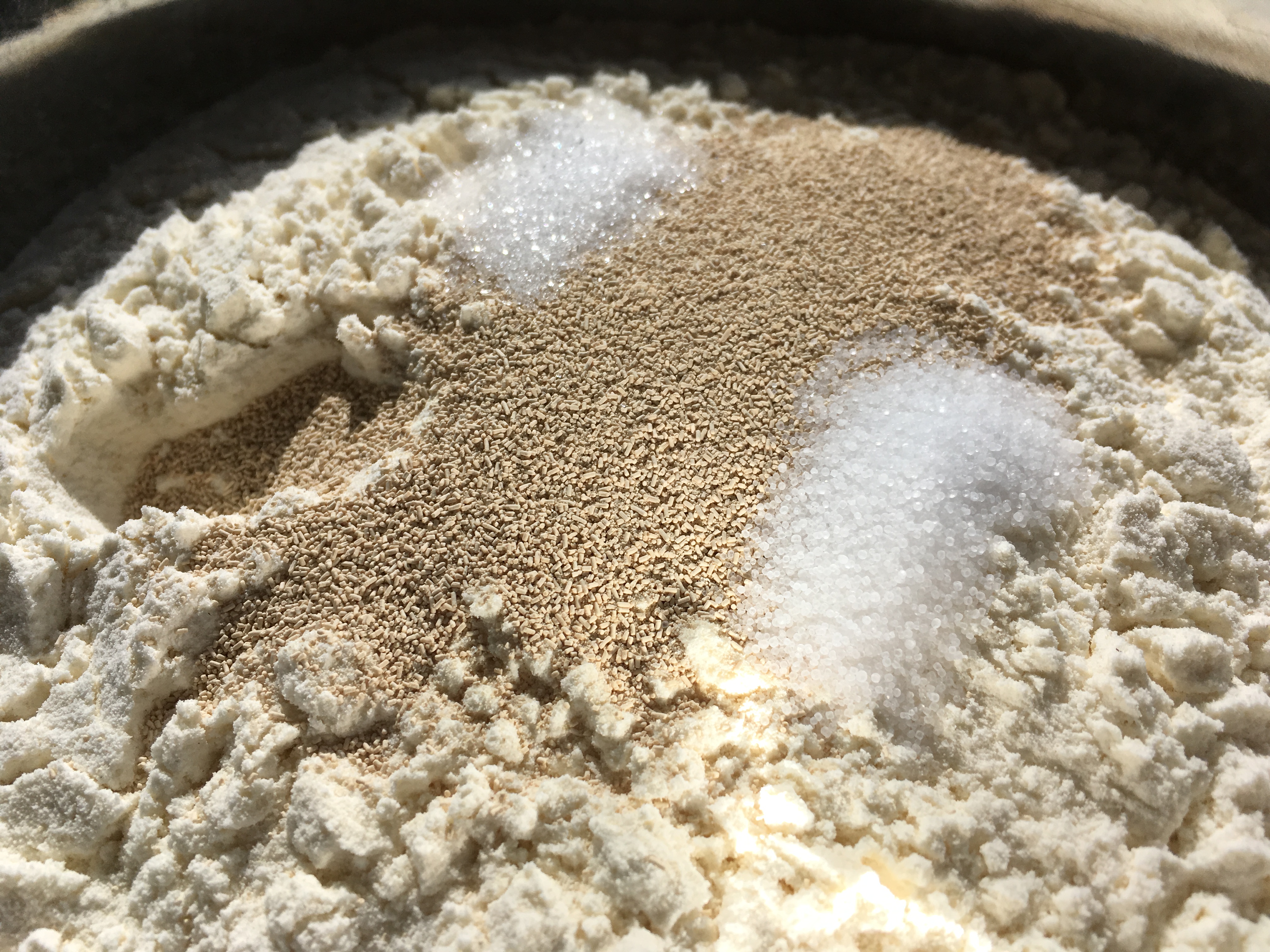 Zutatenübersicht Trockene Zutaten Hefe, Salz und Zucker hinzufügen, dann auch das Wasser, und alles vermischen.