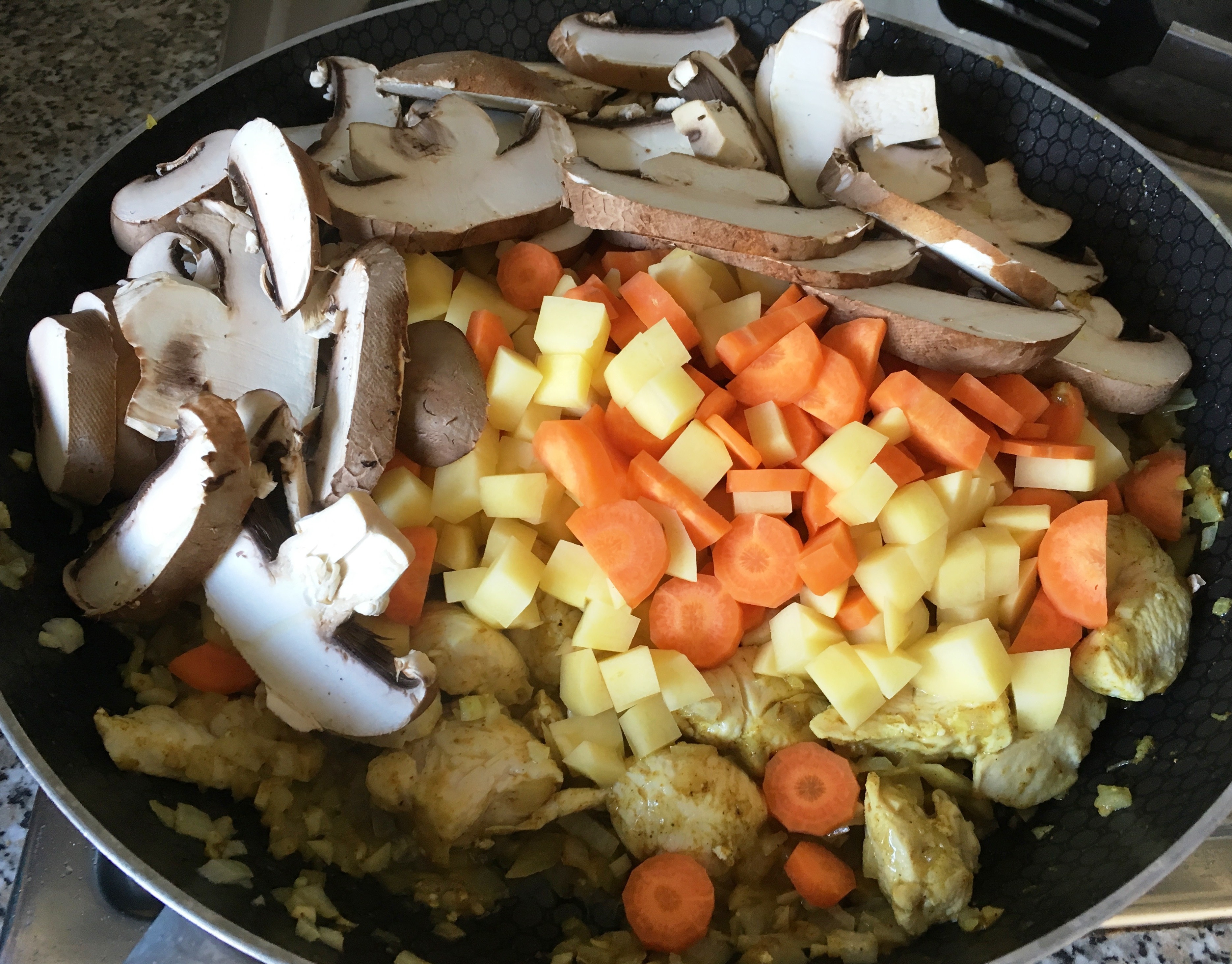 Fleisch anbraten Zwiebeln, Knoblauch, Curry mitbraten - dann das Gemüse hinzufügen.