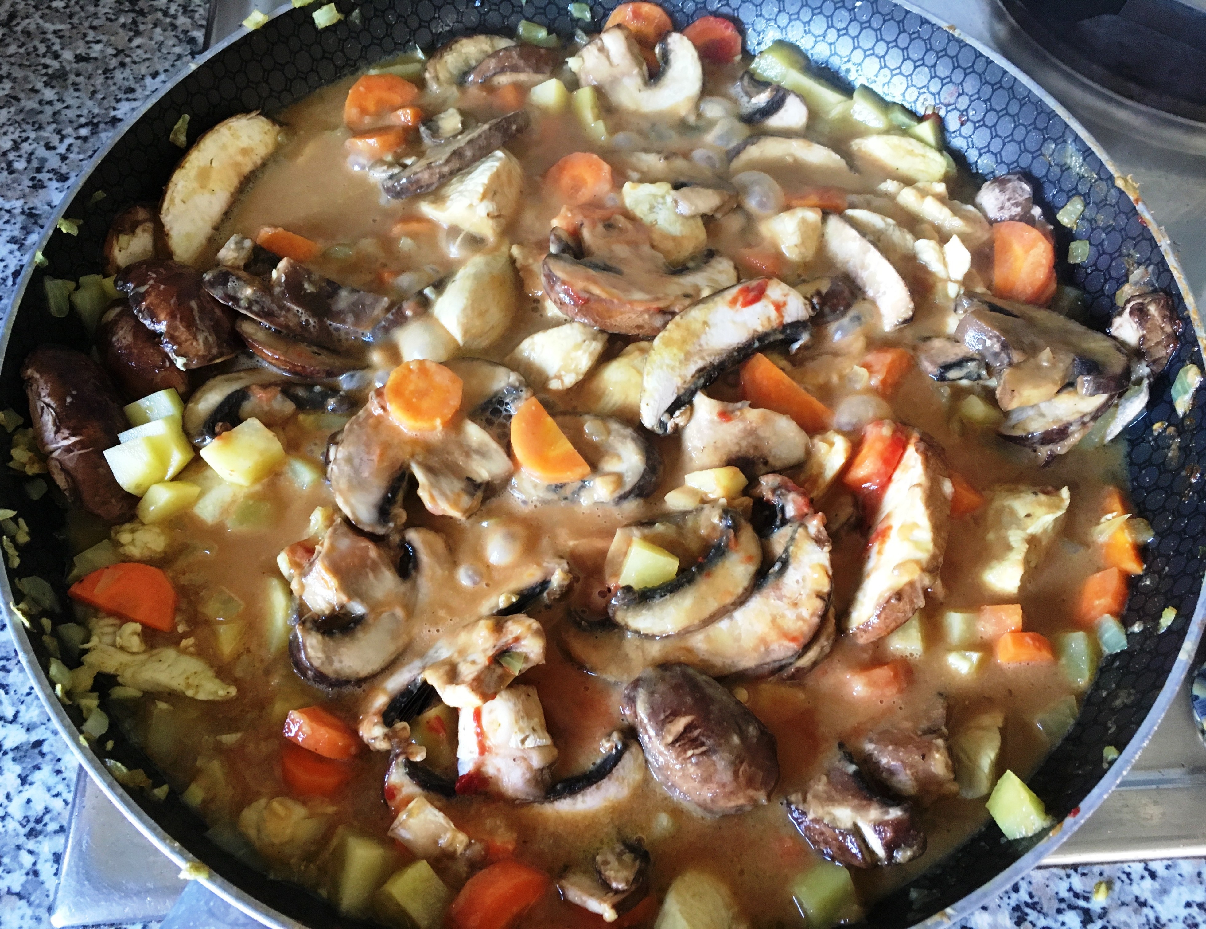 Brühe, Erdnussbutter, Tomatenmark, Sojasoße zugeben - Aufkochen, zudecken und bei kleiner Hitze 20 – 30 Minuten kochen lassen, bis Fleisch und Gemüse gar sind, dabei immer wieder umrühren, damit nichts ansetzt.