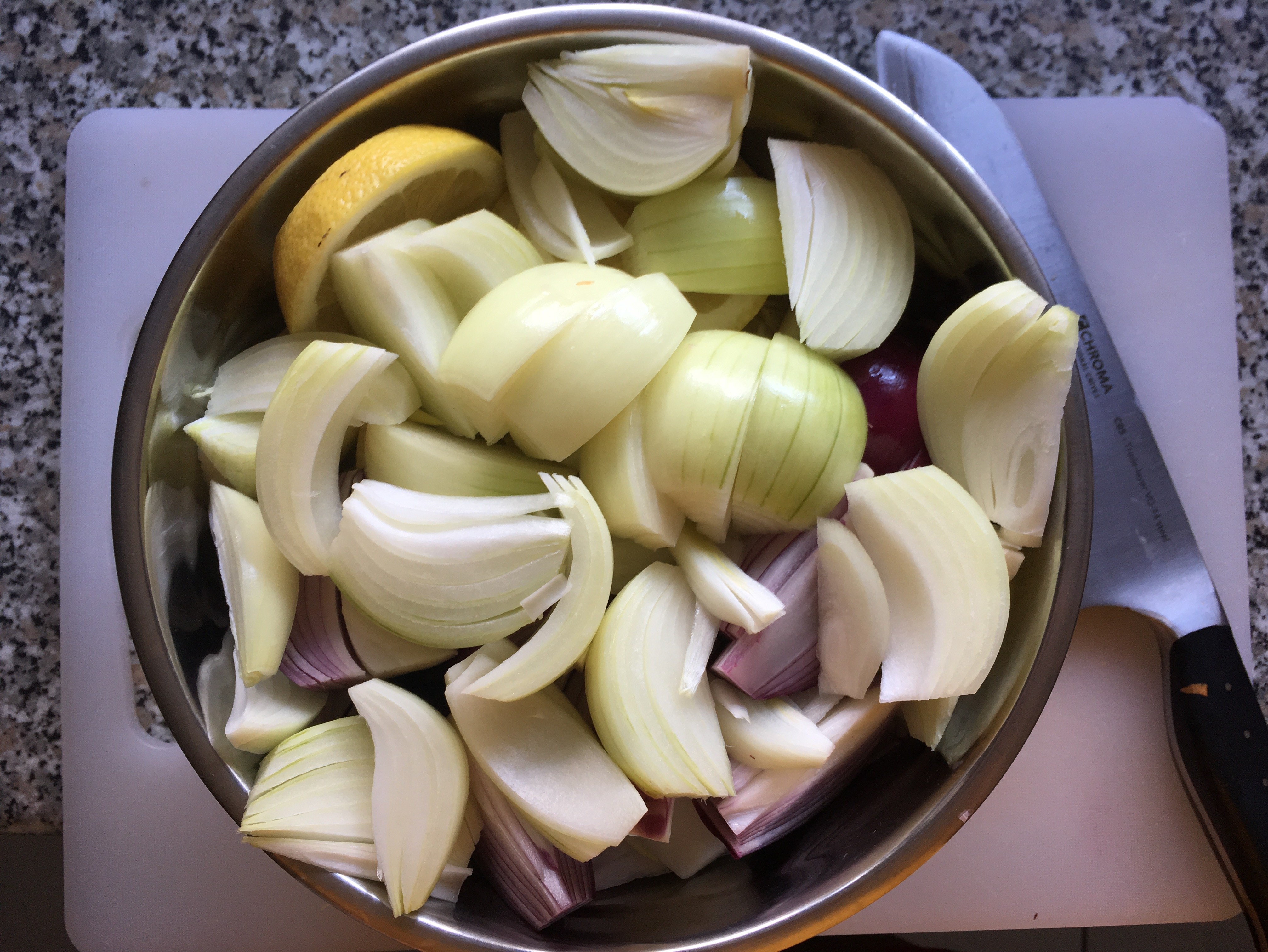 - Die Zitronen in Scheiben schneiden und die Zwiebeln ebenfalls in Schnitze schneiden.
