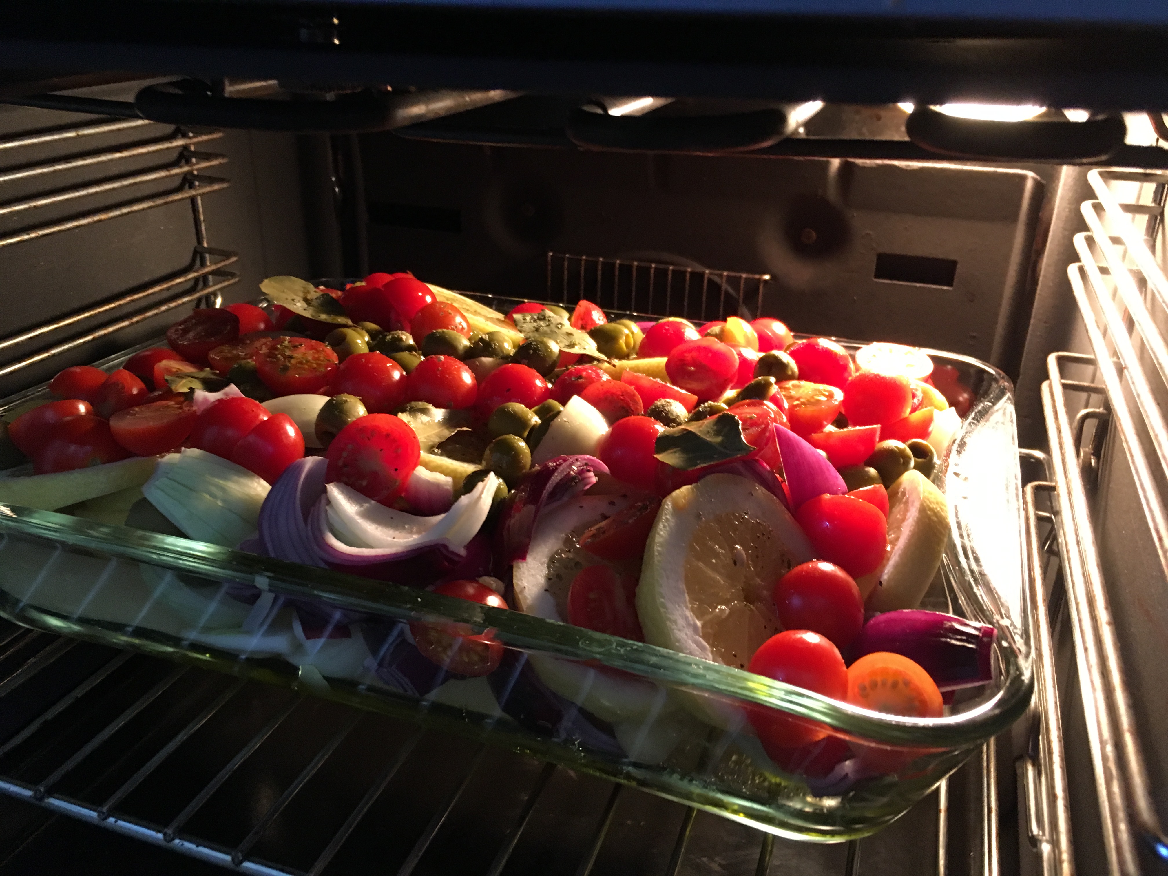 - Zum Schluss Olivenöl und weißen Balsamico Essig darüber träufeln, alles gut vermischen und in den Ofen geben.