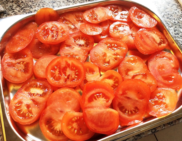 - Wir wählen eine große, fleischige Sorte Tomaten, schneiden mehrere dünne Scheiben davon ab, salzen, lassen sie eine Weile stehen und gießen die Flüssigkeit ab.