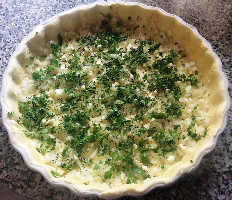 Blätterteig auslegen, mit Senf bestreichen - Eine Zwiebel und eine Knoblauchzehe sehr fein scheiden würfeln, gemischte Kräuter wie Thymian und Petersilie hacken und alles auf den Kuchenboden geben. Ihr könnt die Menge erst schneiden, mischen und dann auf die Tarte geben, oder wie ich, auf der Tarte direkt schichten.