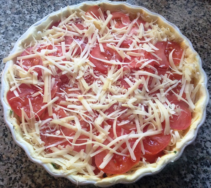Tomaten schneiden, salzen - Anschließend einen Fertigteig (Blätterteig Ich liebe einfach Blätterteig 🙂 oder salzigen Mürbeteig) ausrollen, in eine (Quiche-)Form geben und dünn mit Senf bepinseln. Ihr seht auf meinem Bild die Senfmenge, und könnt eigentlich ruhig etwas mehr nehmen.