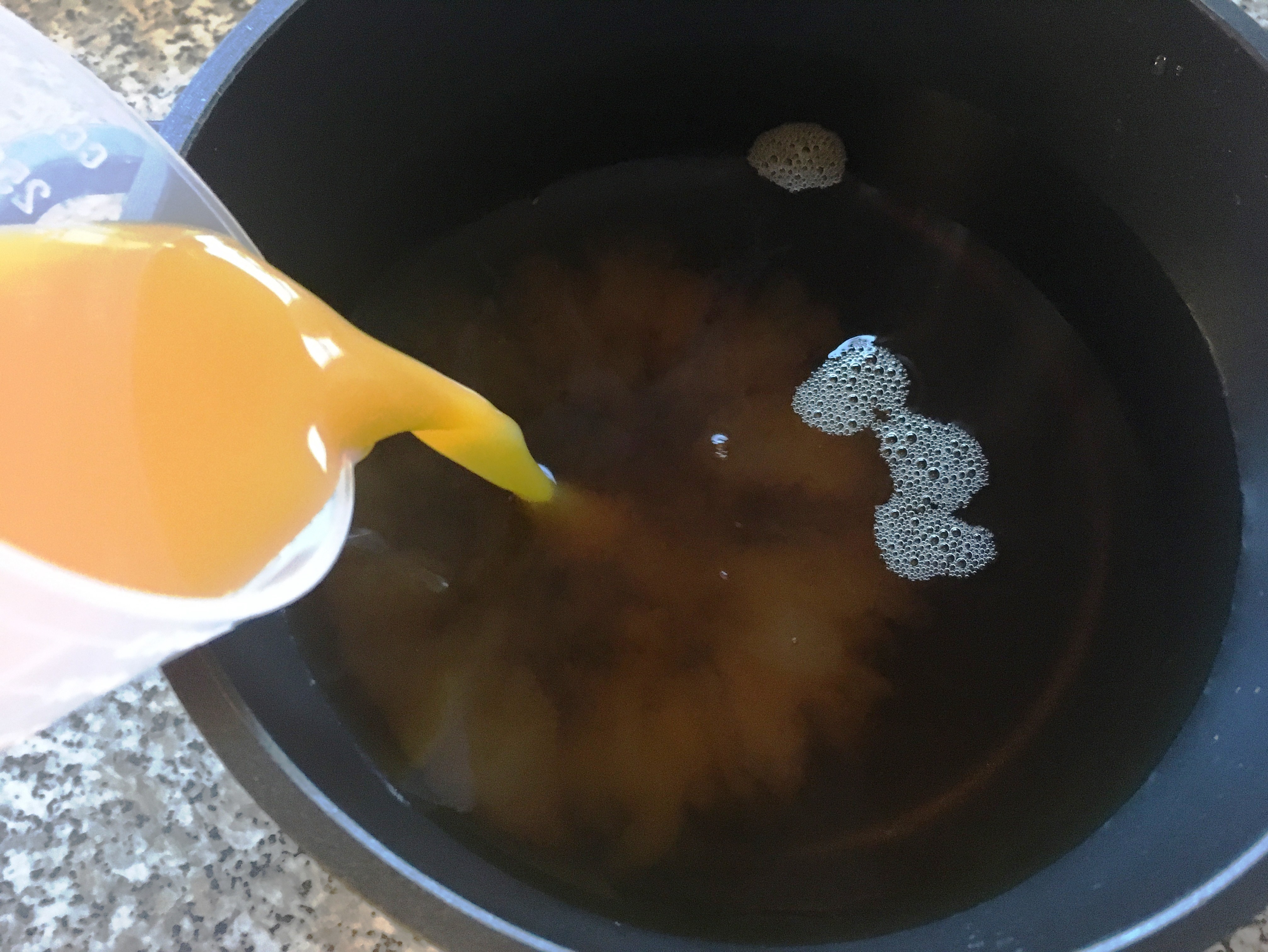 Eischnee unterziehen umfüllen - Für den Guss die beiden Säfte in einen Topf geben und aufkochen. Den Zucker zufügen