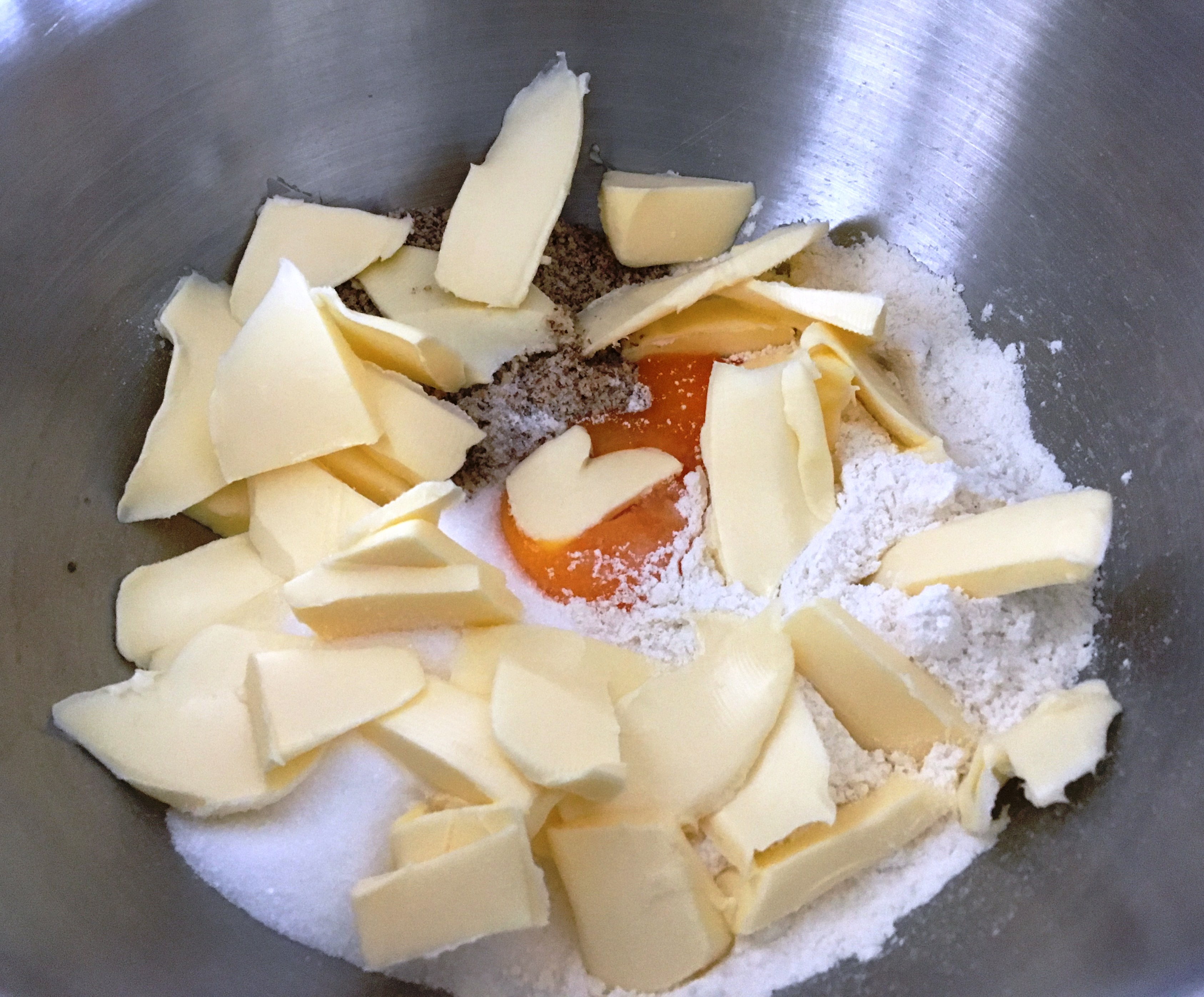 Butter, Mandeln, Mehl, Zucker, Salz und Eigelb Teigkugel Teig formen - Den Ofen auf 180°C vorheizen.