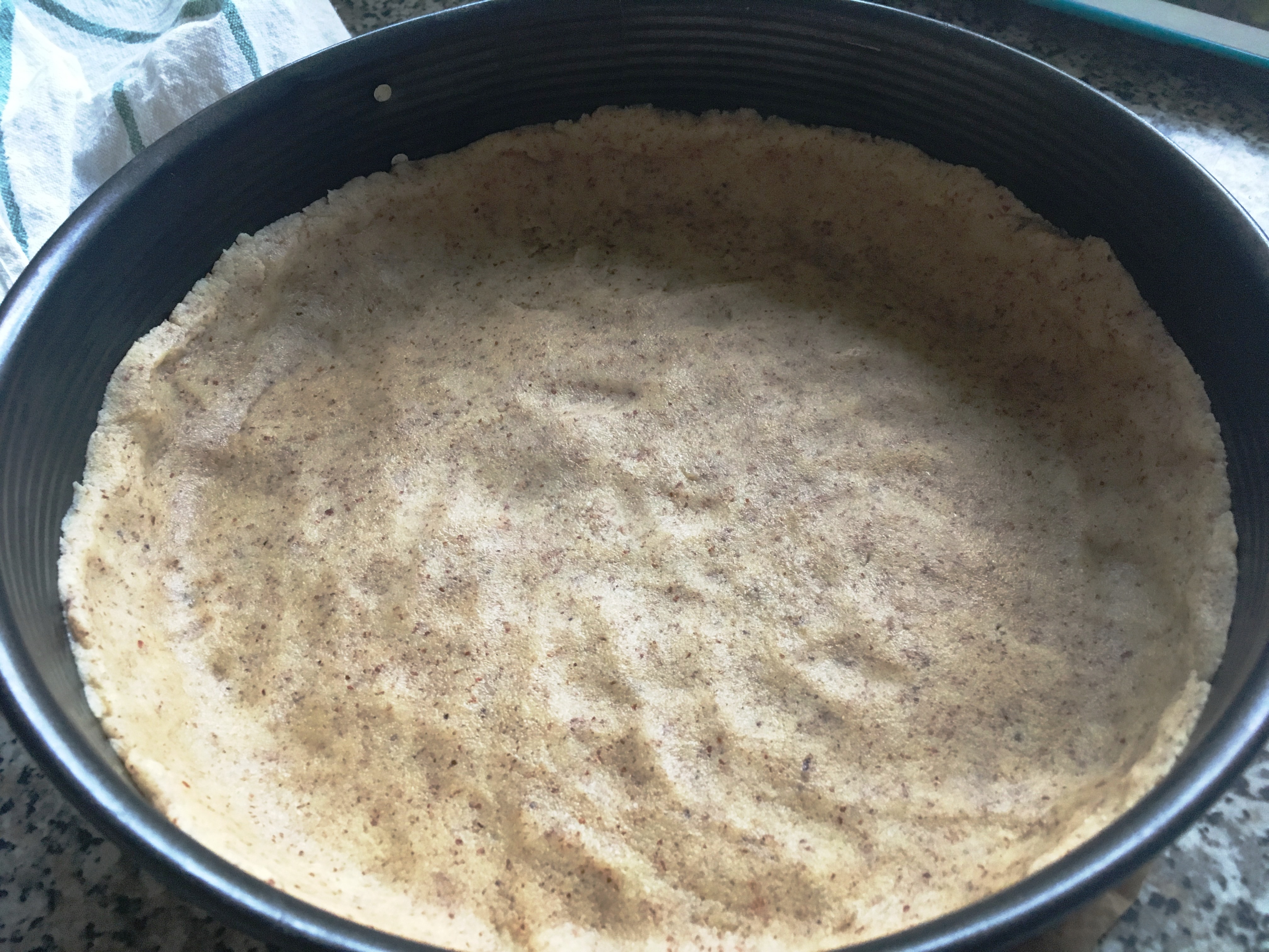 - Die Butter mit den gemahlenen Mandeln, dem Mehl, dem Zucker, der Prise Salz und dem Eigelb verkneten, zugedeckt im Kühlschrank mindestens 30 Minuten ruhen lassen. Eine Springform mit Backpapier auslegen. Den Teig einfüllen und mit möglichst kalten Händen vorsichtig platt drücken, bis der Boden gleichmäßig bedeckt ist. Teig an den Rändern hochziehen.