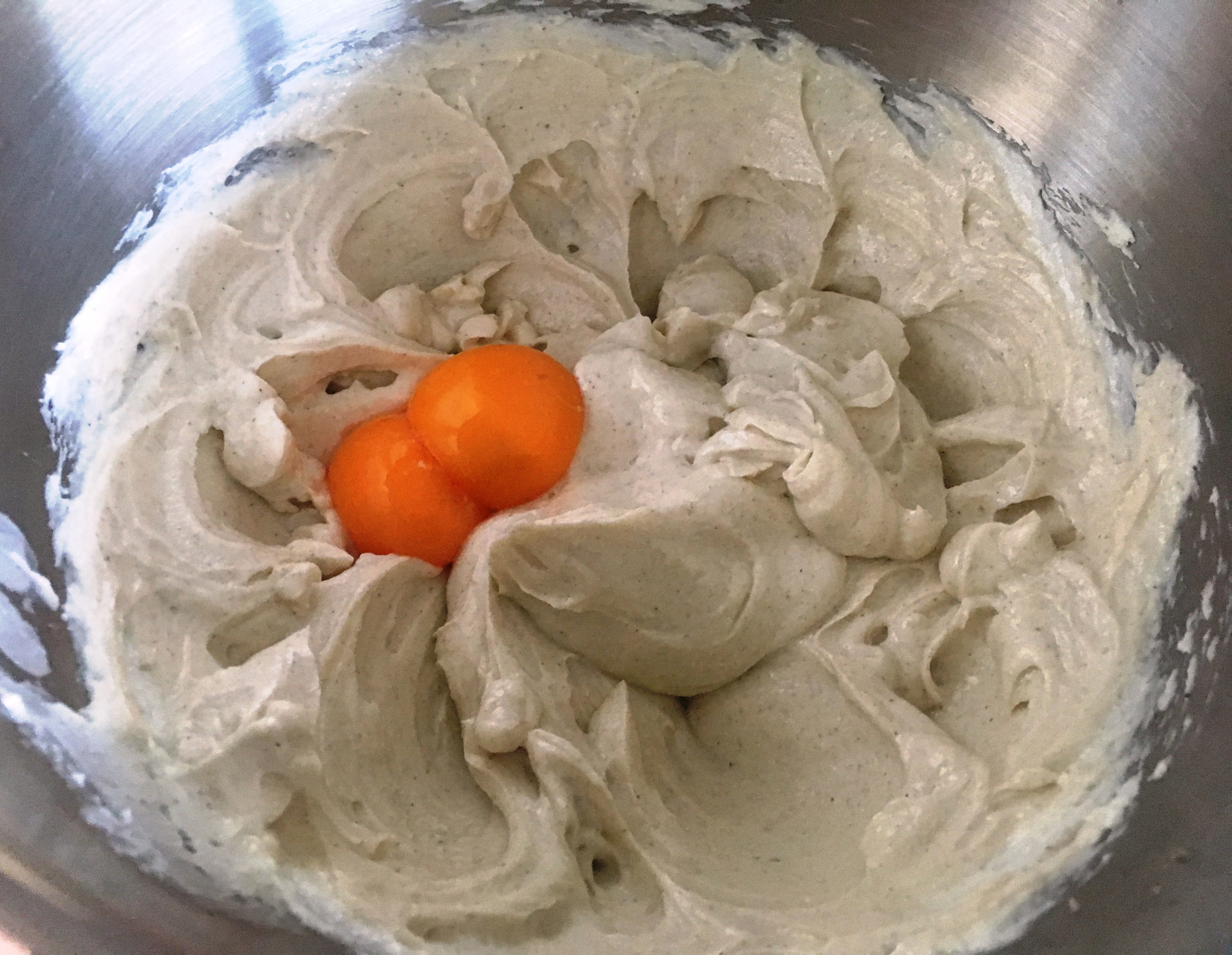 Butter, Zucker und Vanillezucker Quark unterrühren - Die beiden Eier trennen und die Eigelbe 35g unterziehen. Auch die Crème fraîche sowie die Speisestärke nun gut unterrühren.