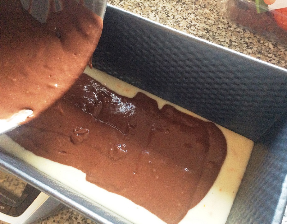 4. Als erstes die mit Orangen aromatisierte Masse in die eingefette Backform geben, danach die mit Kakao. Für die Marmorierung einen Löffel durch den Teig ziehen und anschließend die Oberfläche glatt streichen. An dieser Stelle könnt ihr euch gestalterisch komplett austoben. Ihr könnt z.B. auch statt gleichmäßig eingießen, nur an diversen Stellen und anschließend verwirbeln.