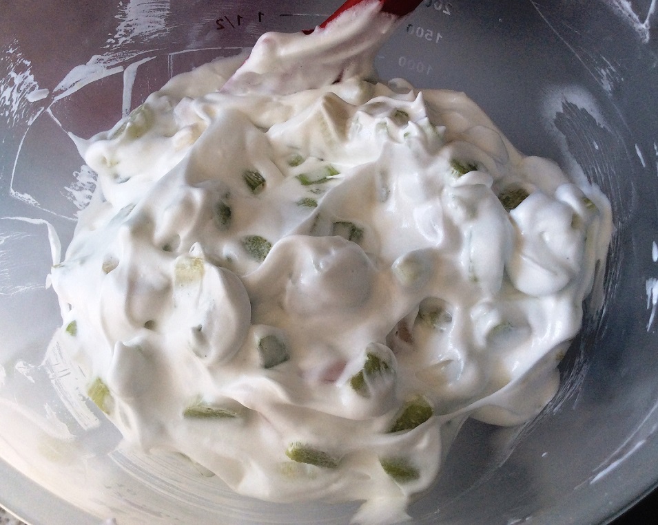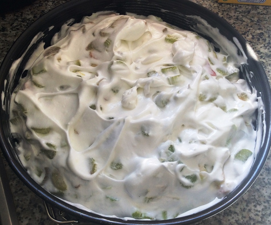 3. Rhabarber putzen, stückeln und zusammen mit dem Mondamin unterheben.