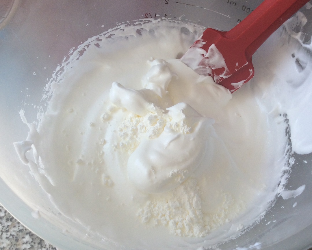 2. Eiweiß und Zucker steif schlagen. Bitte erst das Eiweiß ohne Zucker zu schlagen beginnen, dann nach und nach den Zucker zugeben.