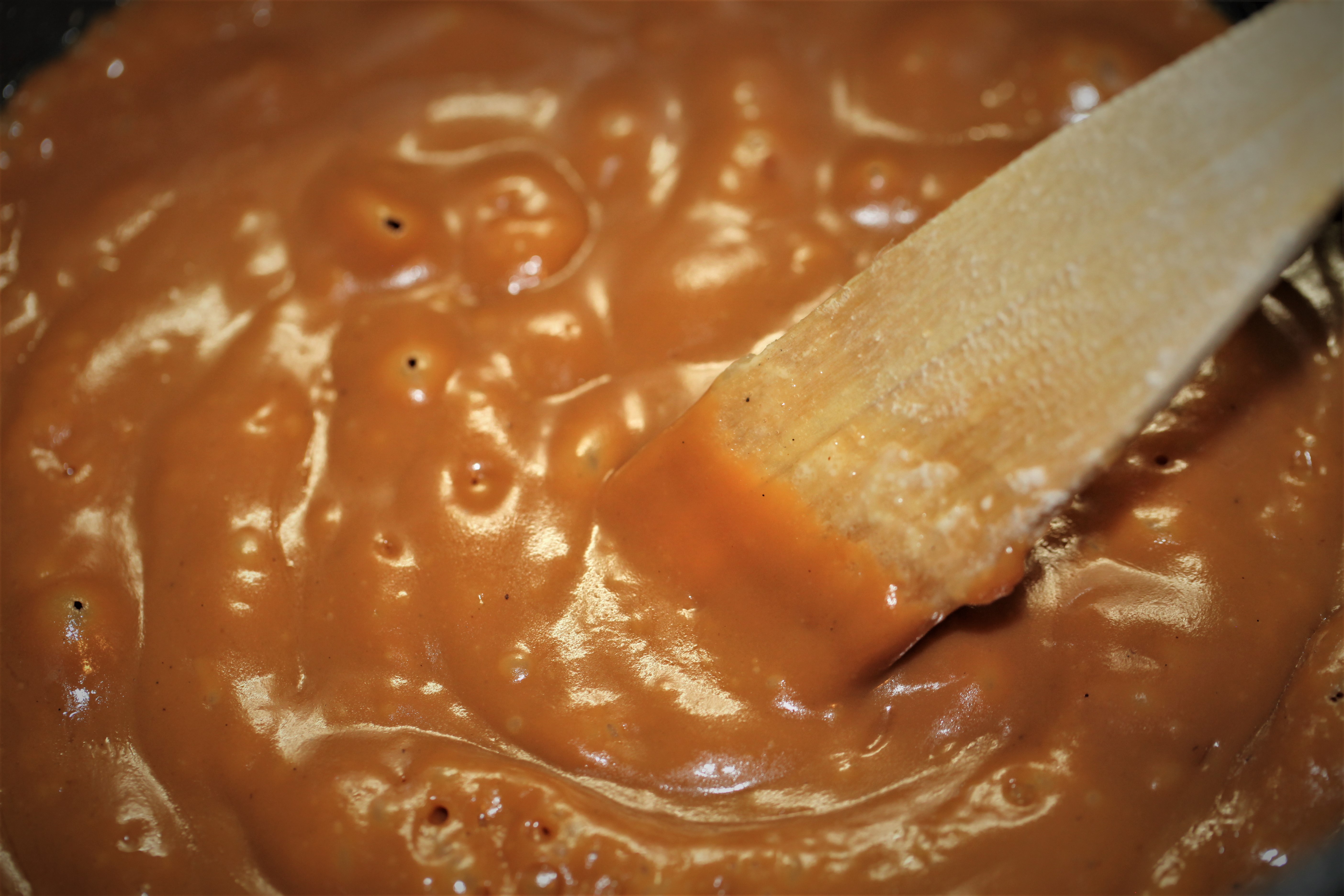 Die Masse sollte dabei einen goldenen Farbton annehmen und nach Karamell duften, allerdings nicht zu stark bräunen. Daher unbedingt ein Auge auf den Topf haben, denn Karamell kann von einer Sekunde auf die andere verbrennen und ist dann nicht mehr brauchbar. - Ist die Temperatur von ca. 160 erreicht, sofort ohne zu zögern 1/5 der Sahne-Butter-Mischung eingießen. Der Karamell wird jetzt wild blubbern, es ist also Vorsicht geboten! Mithilfe des Thermometers zügig unterrühren und die Prozedur wiederholen, bis die gesamte Sahne eingerührt ist.