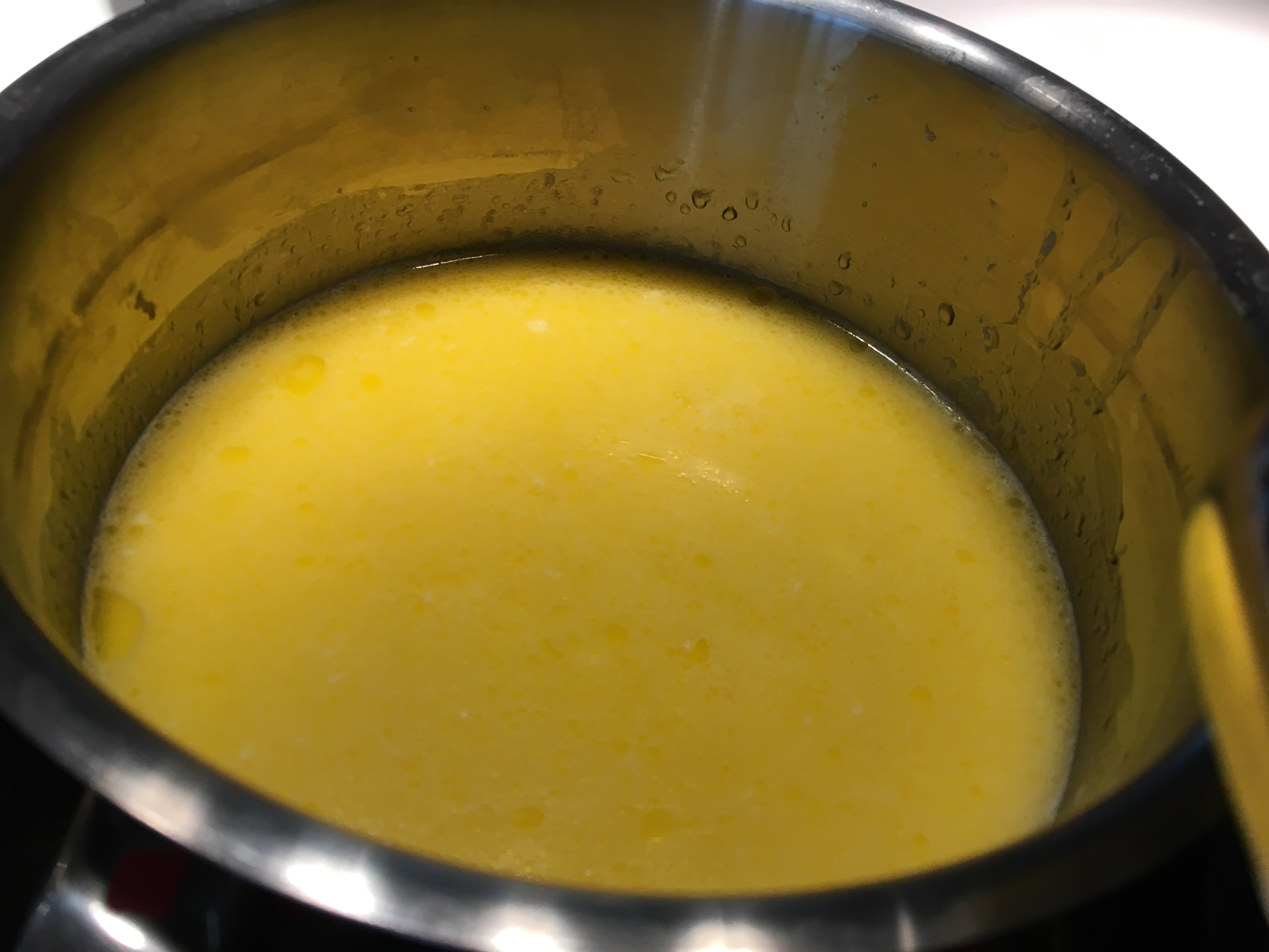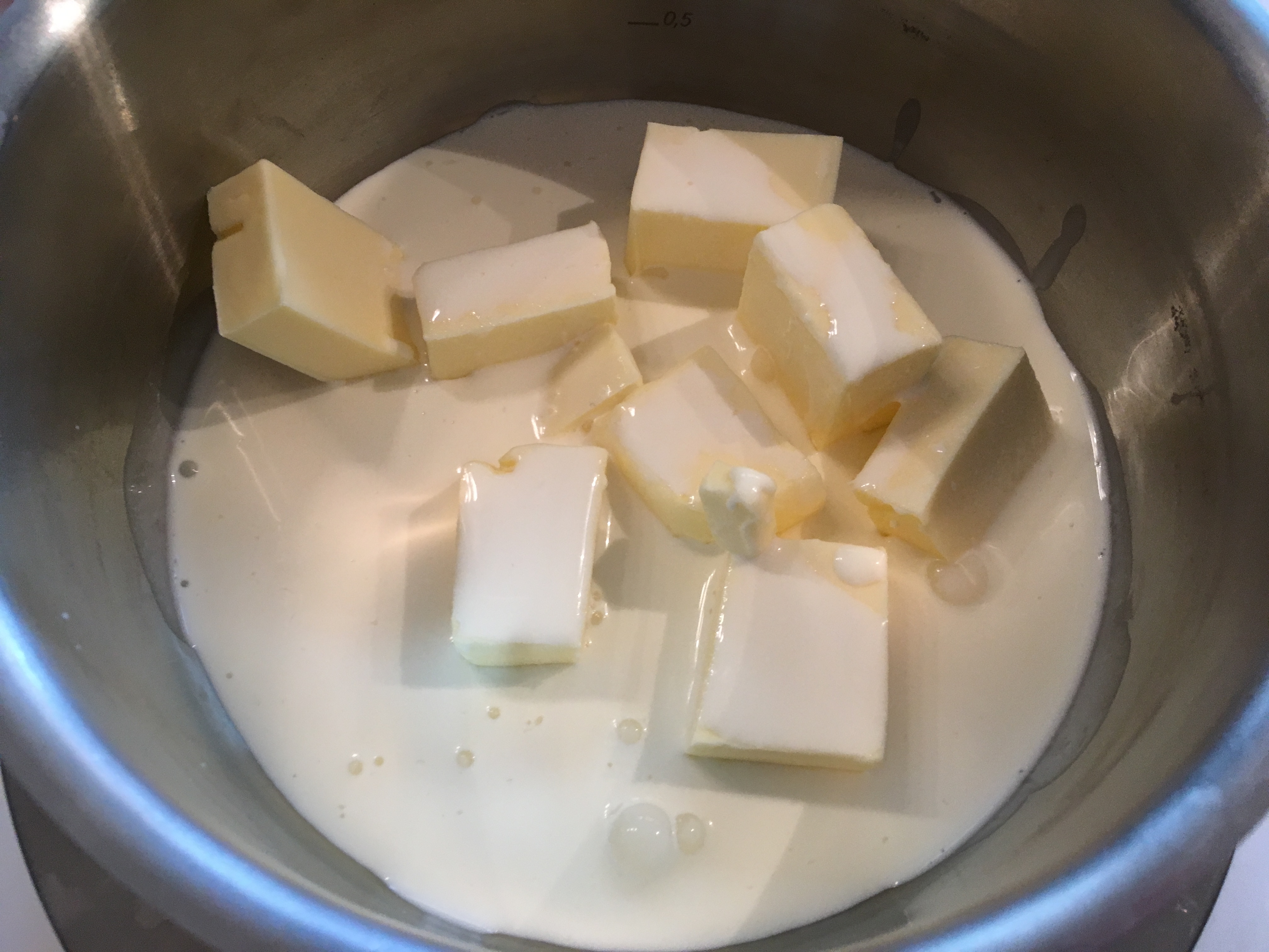 - Schlagsahne und weiche Butter in einem kleinen Topf erwärmen, bis die Butter ganz geschmolzen ist.